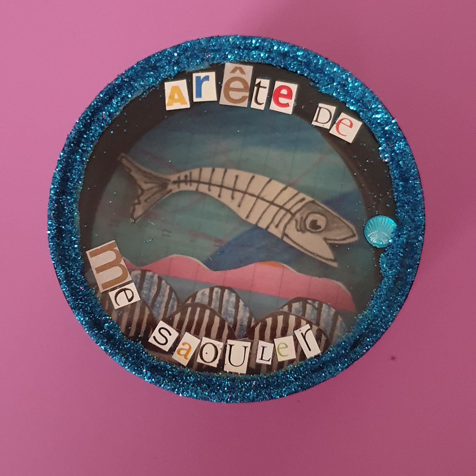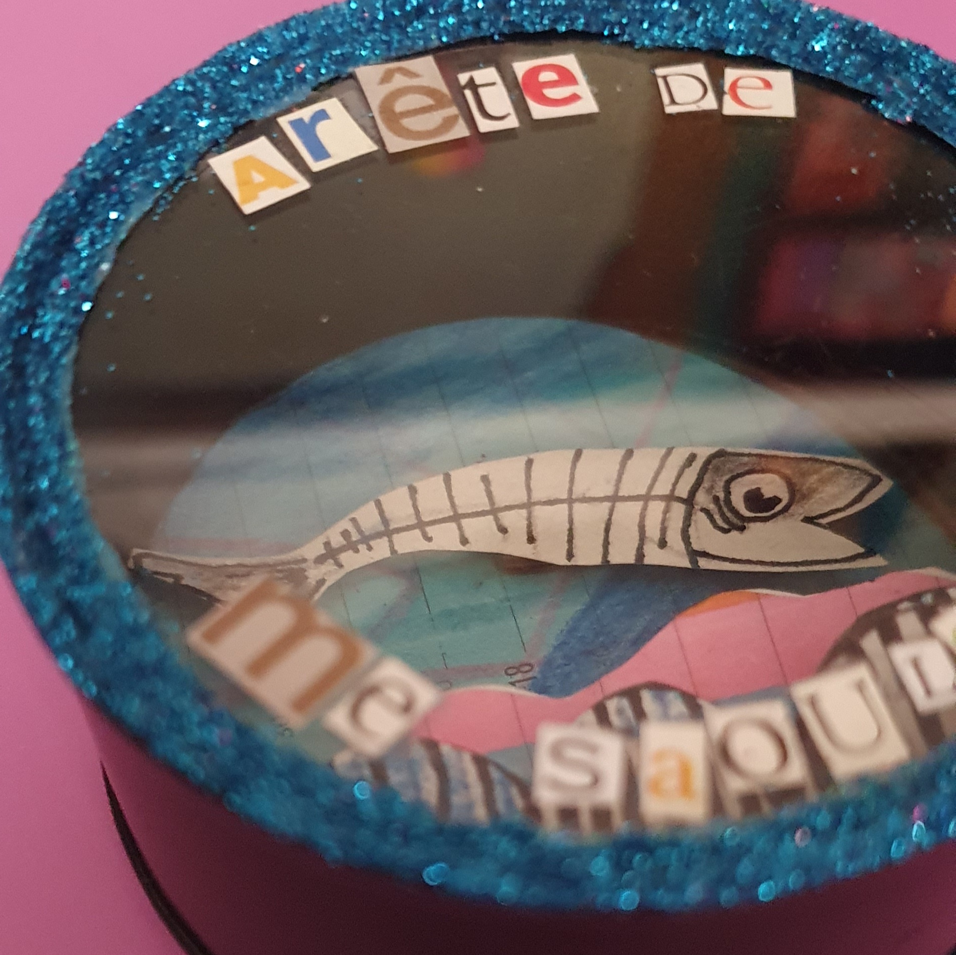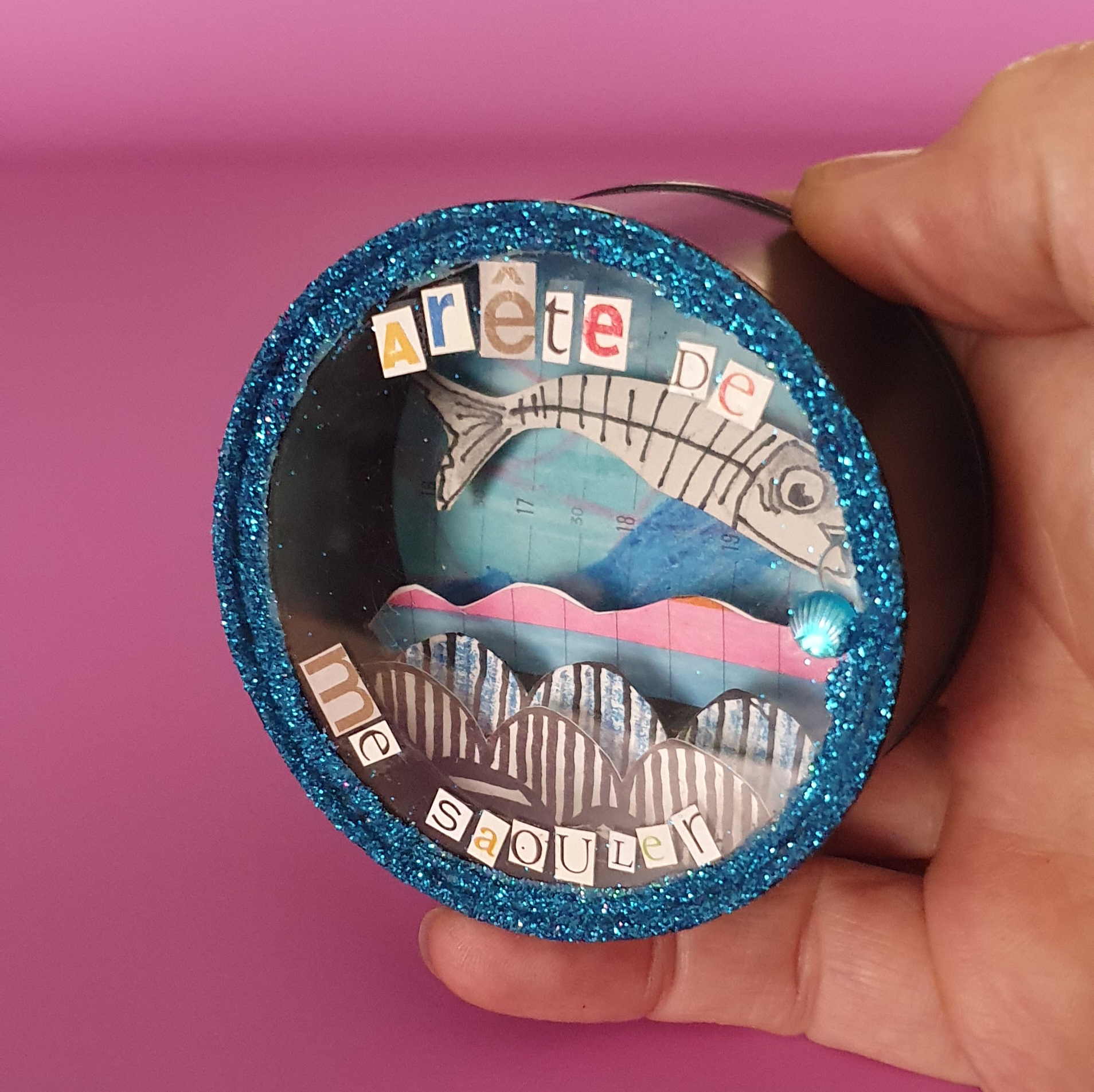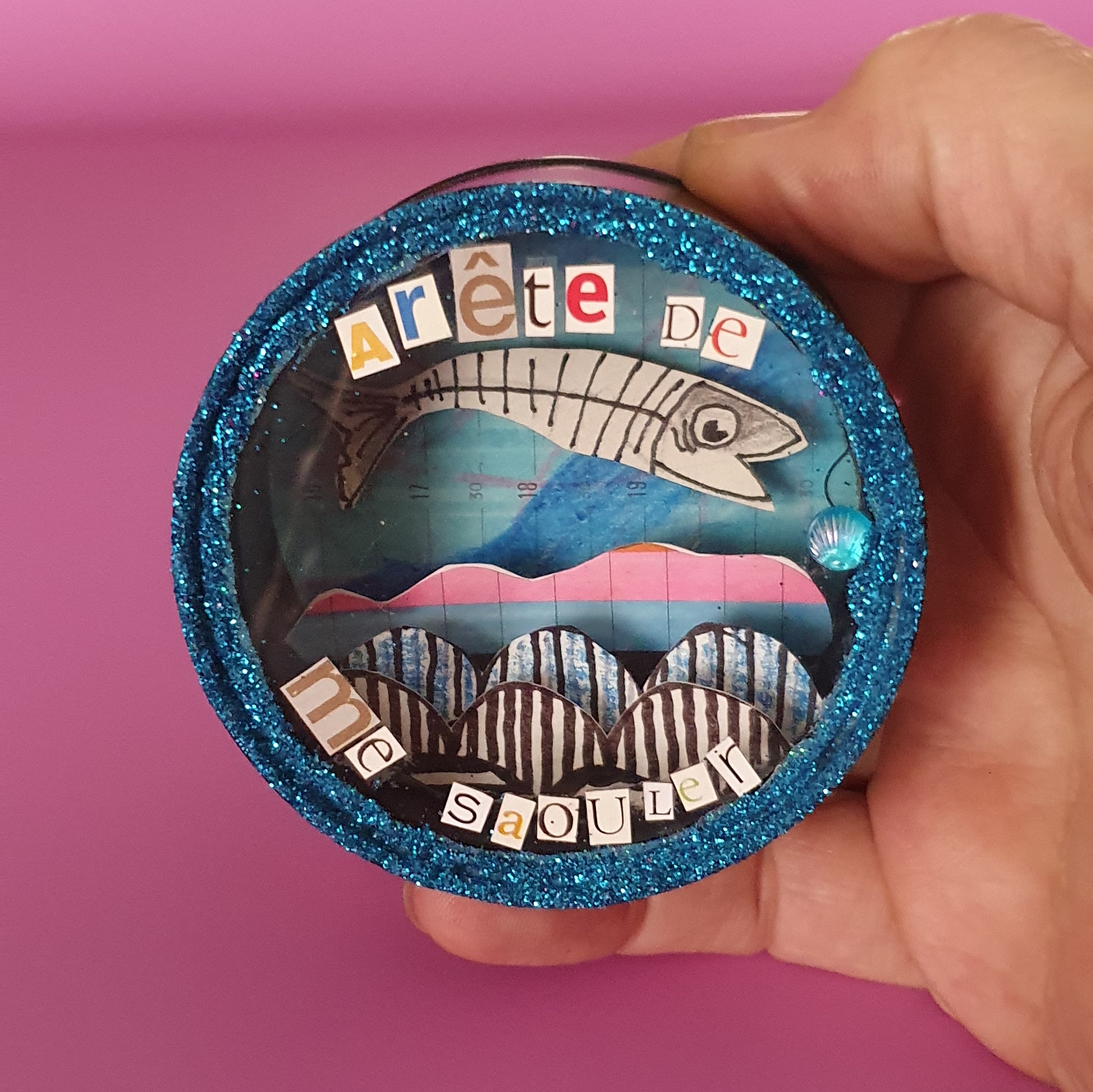 Les mises en boîteConfectionné à l’atelier à partir d’illustrations faite à la main aux crayons de couleurs et d’une boite de conserve recyclée. Cette magnette « Ami-mot » est pensée comme un petit bonbon espiègle à consommer avec humour.