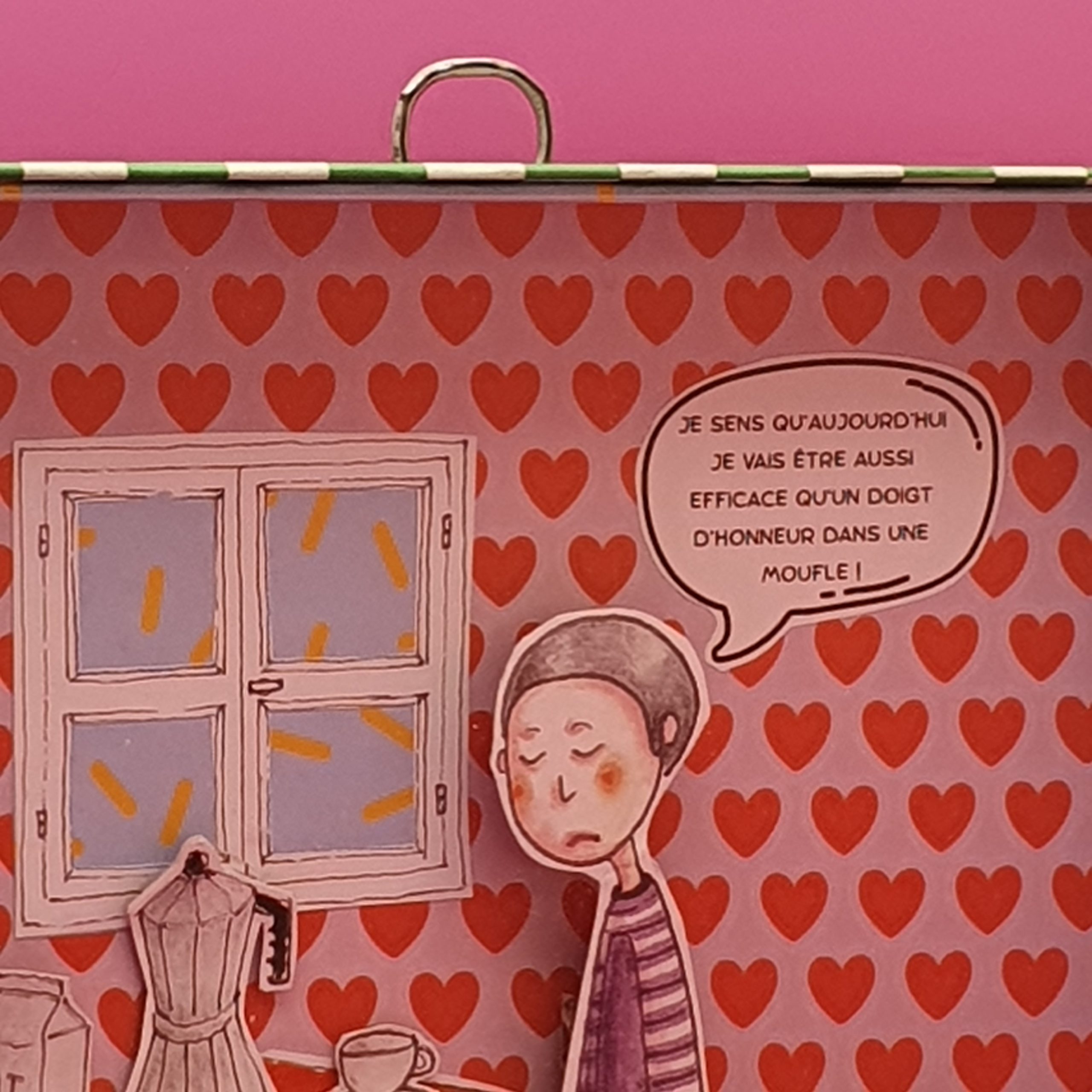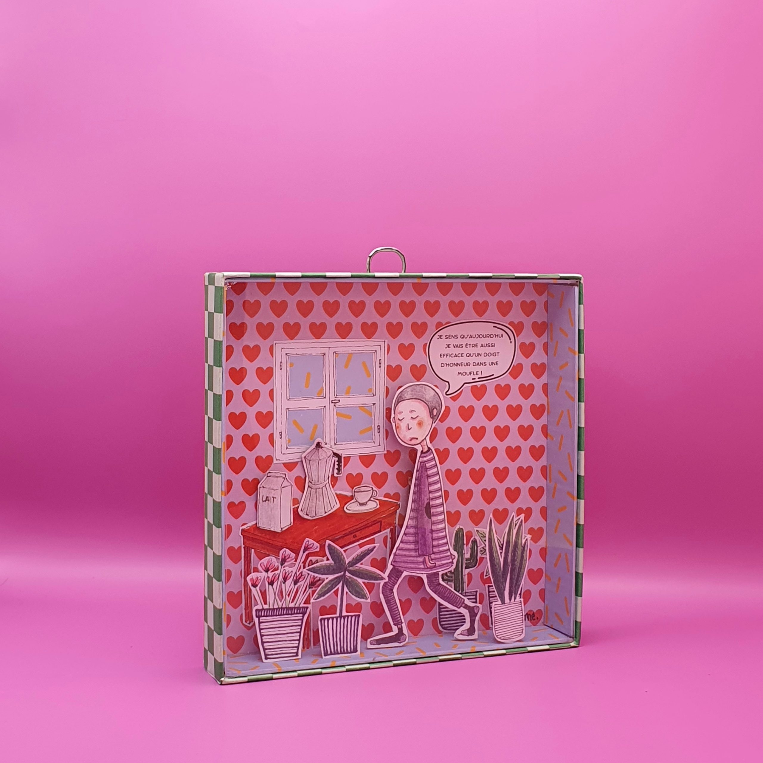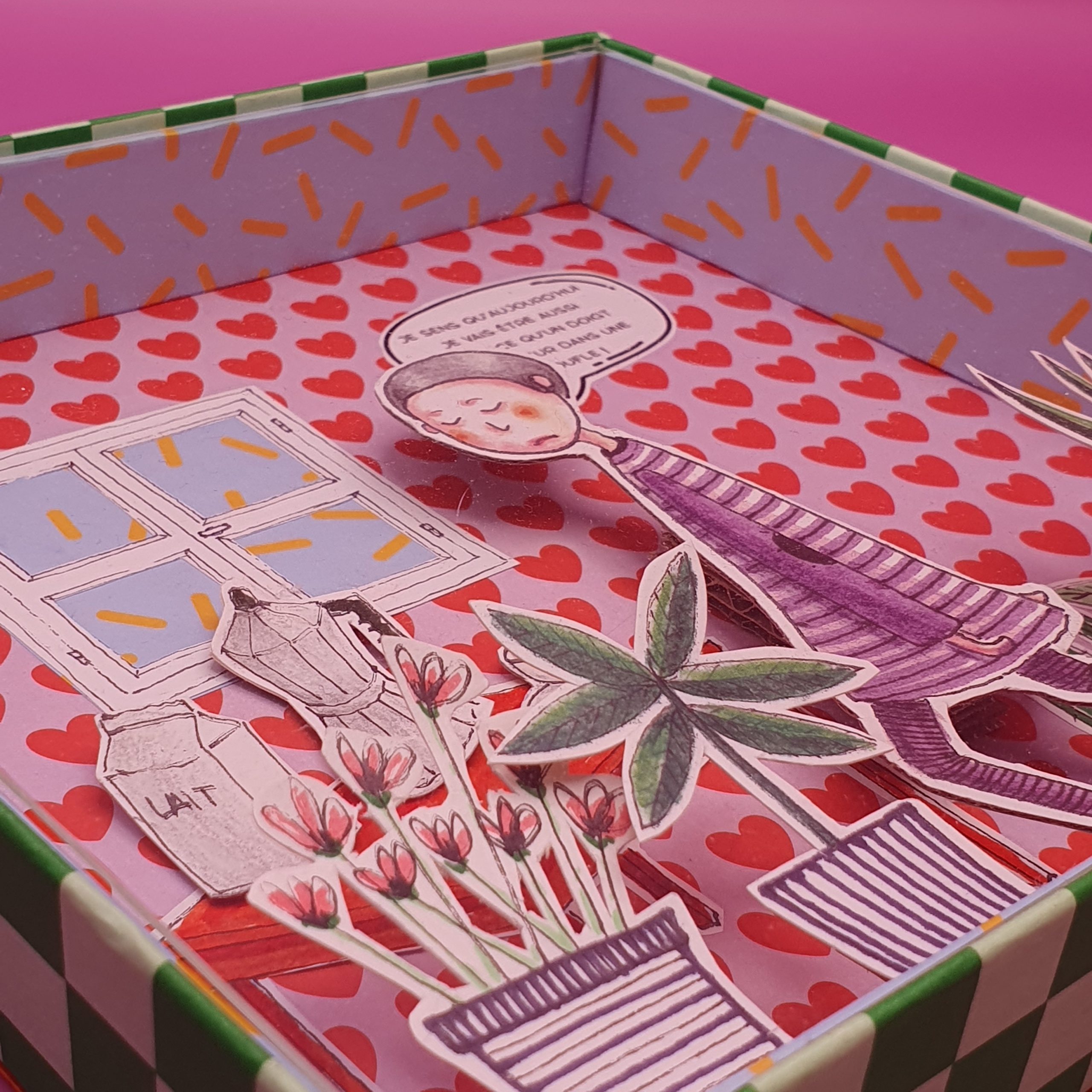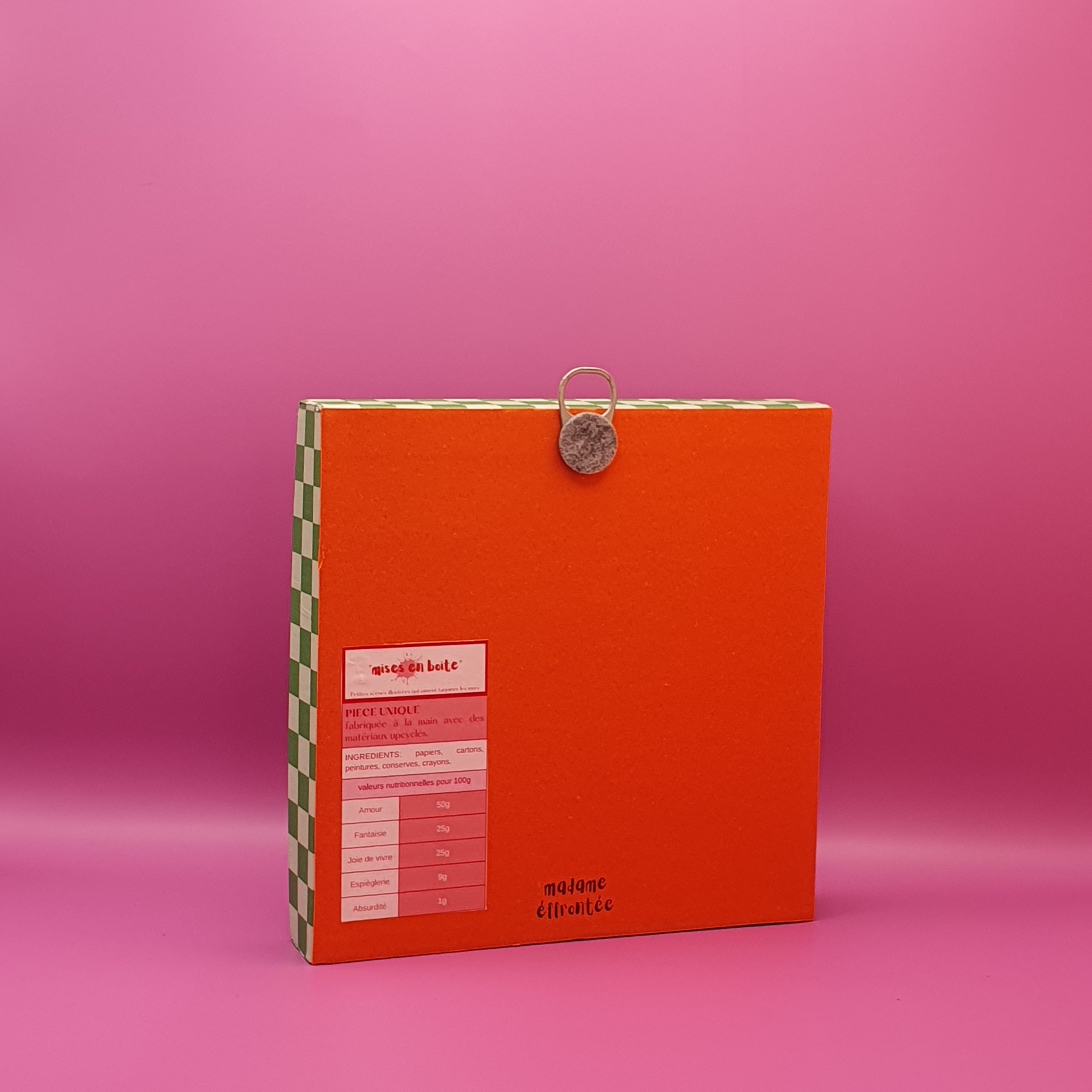 Les mises en boîteConfectionné à l’atelier à partir d’illustrations faite à la main aux crayons de couleurs et de boite de jeux recyclées. Il est pensé comme une fenêtre ouverte sur un monde ludique et taquin.