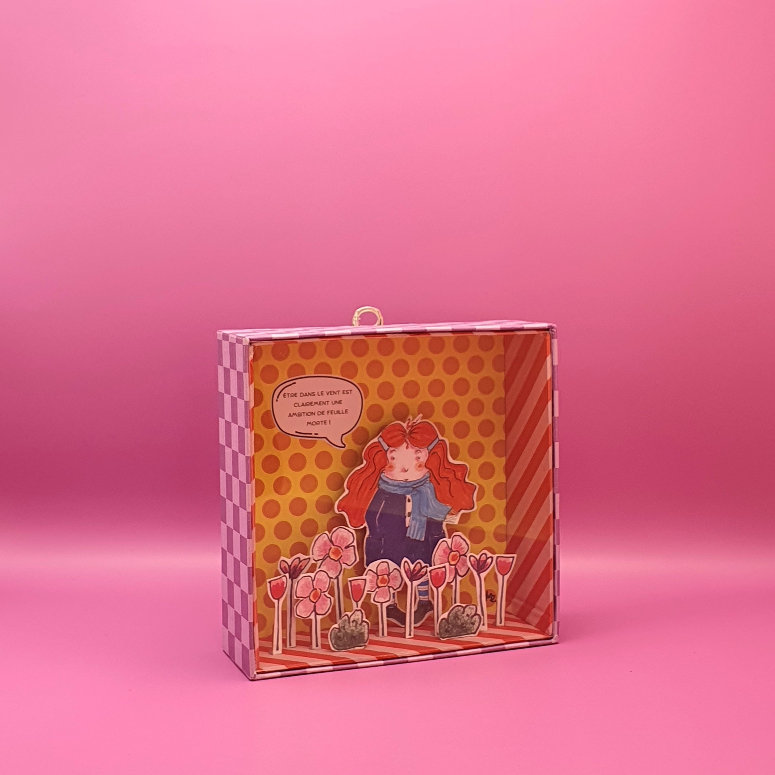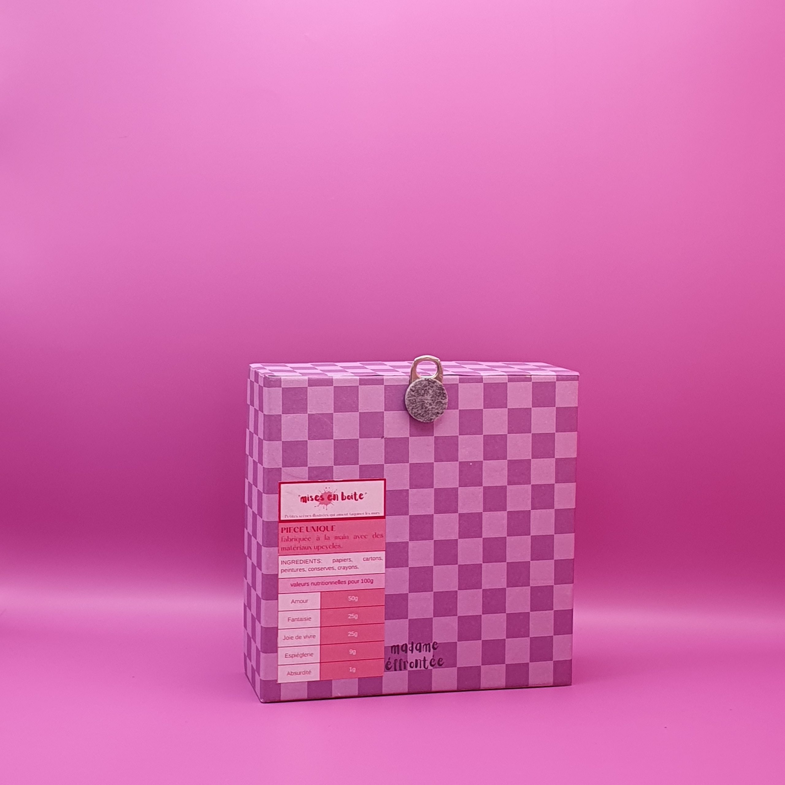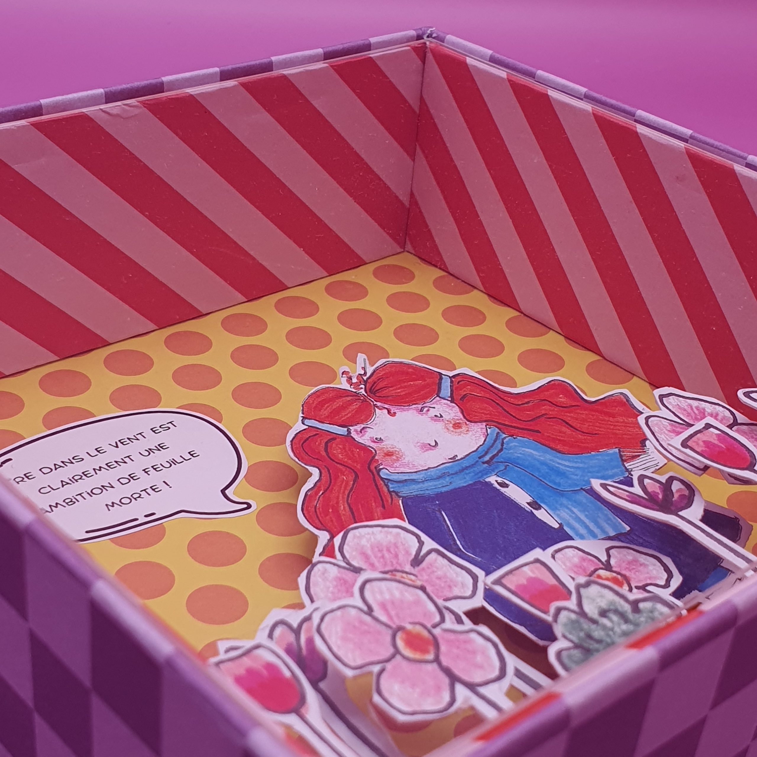 Les mises en boîteConfectionné à l’atelier à partir d’illustrations faite à la main aux crayons de couleurs et de boite de jeux recyclées. Il est pensé comme une fenêtre ouverte sur un monde ludique et taquin.