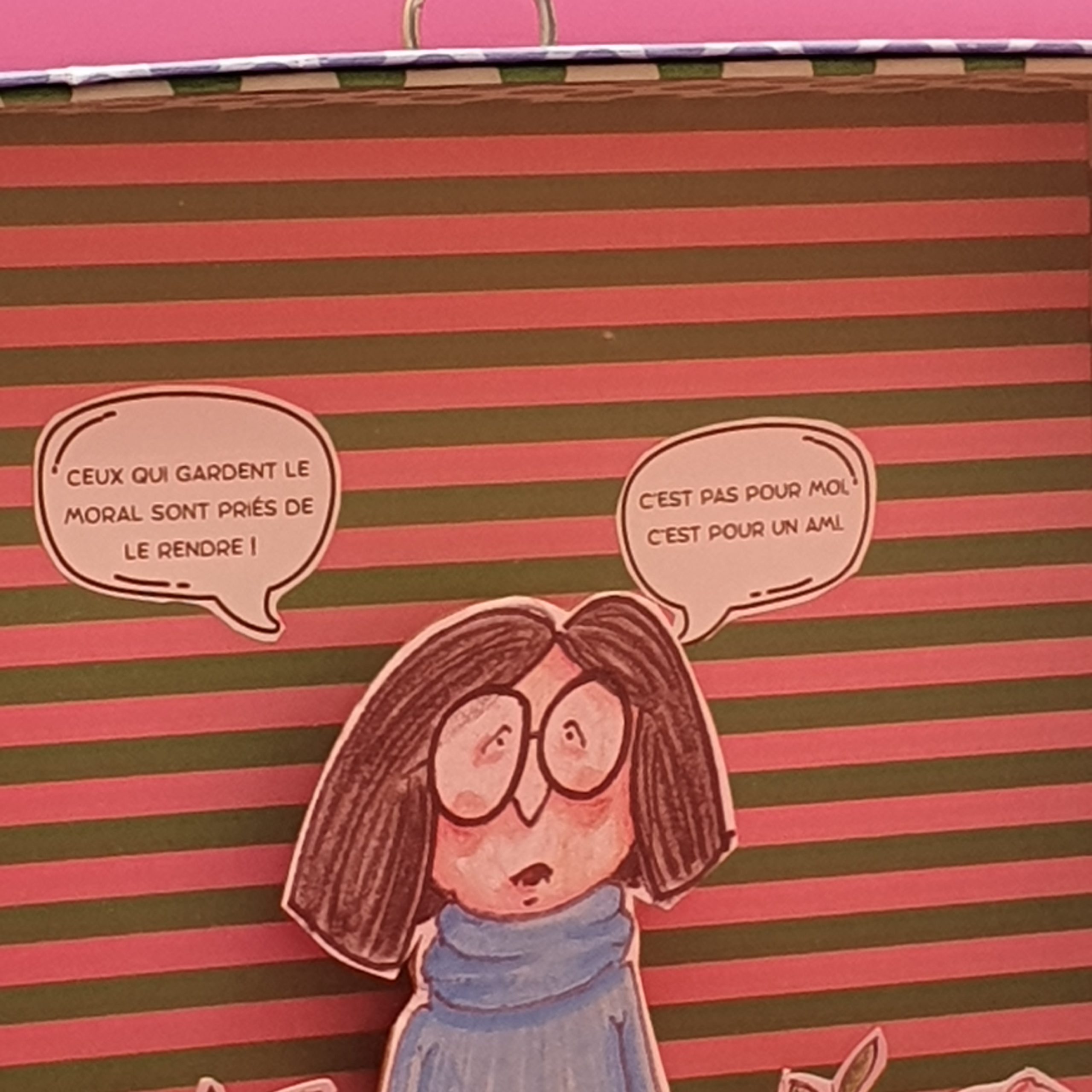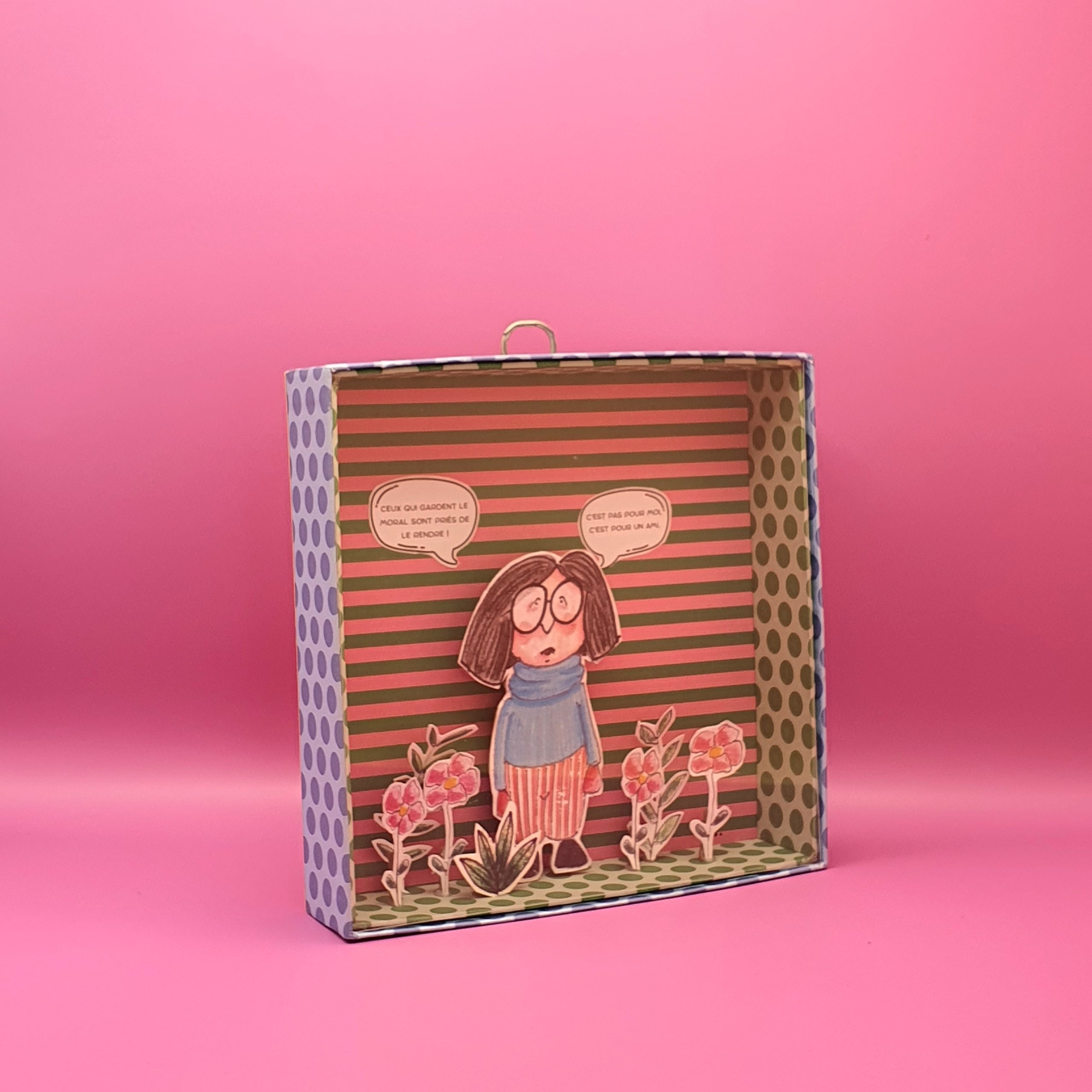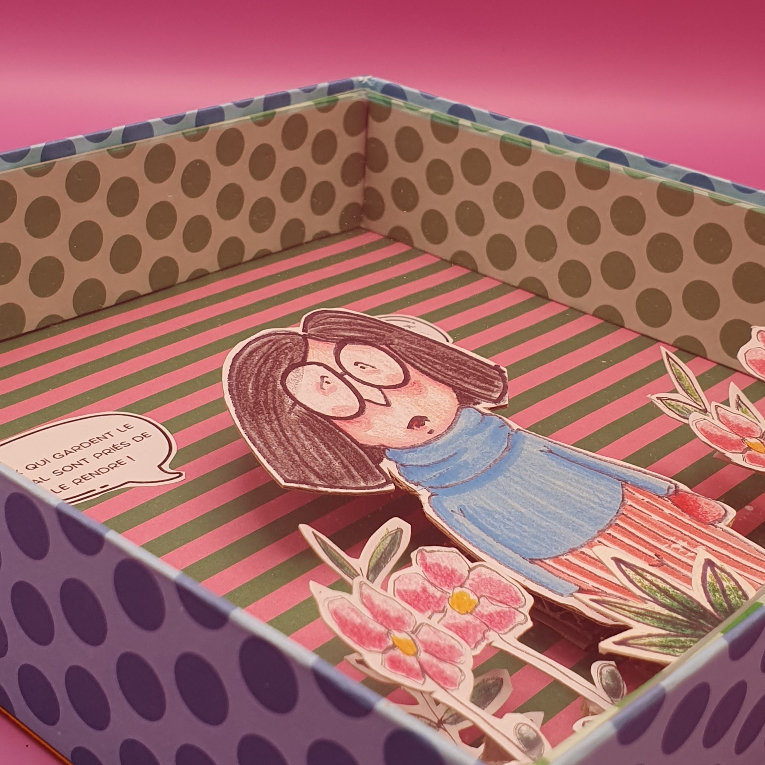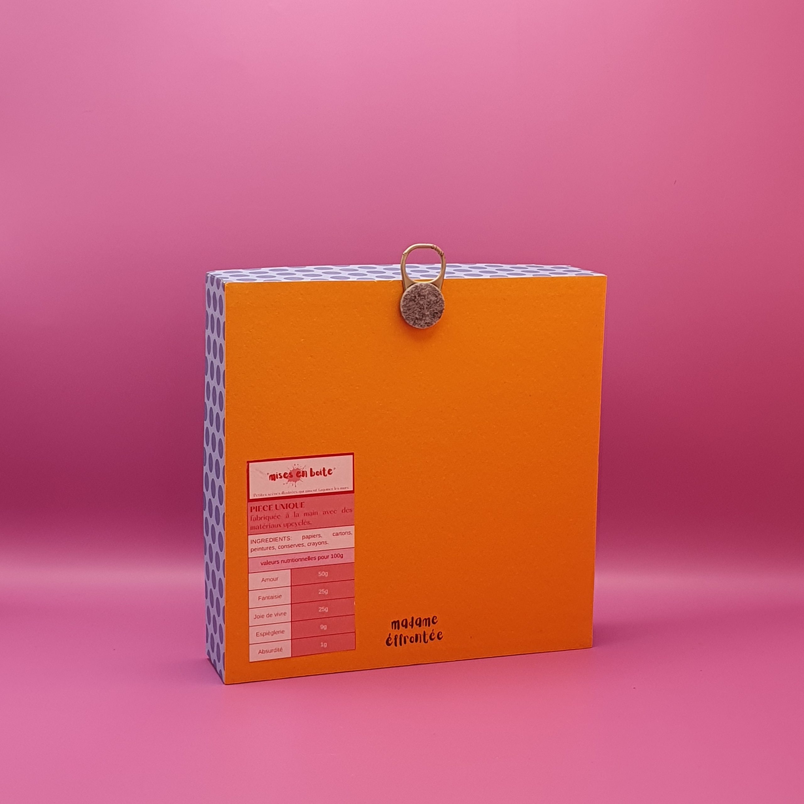 Les mises en boîteConfectionné à l’atelier à partir d’illustrations faite à la main aux crayons de couleurs et de boite de jeux recyclées. Il est pensé comme une fenêtre ouverte sur un monde ludique et taquin.