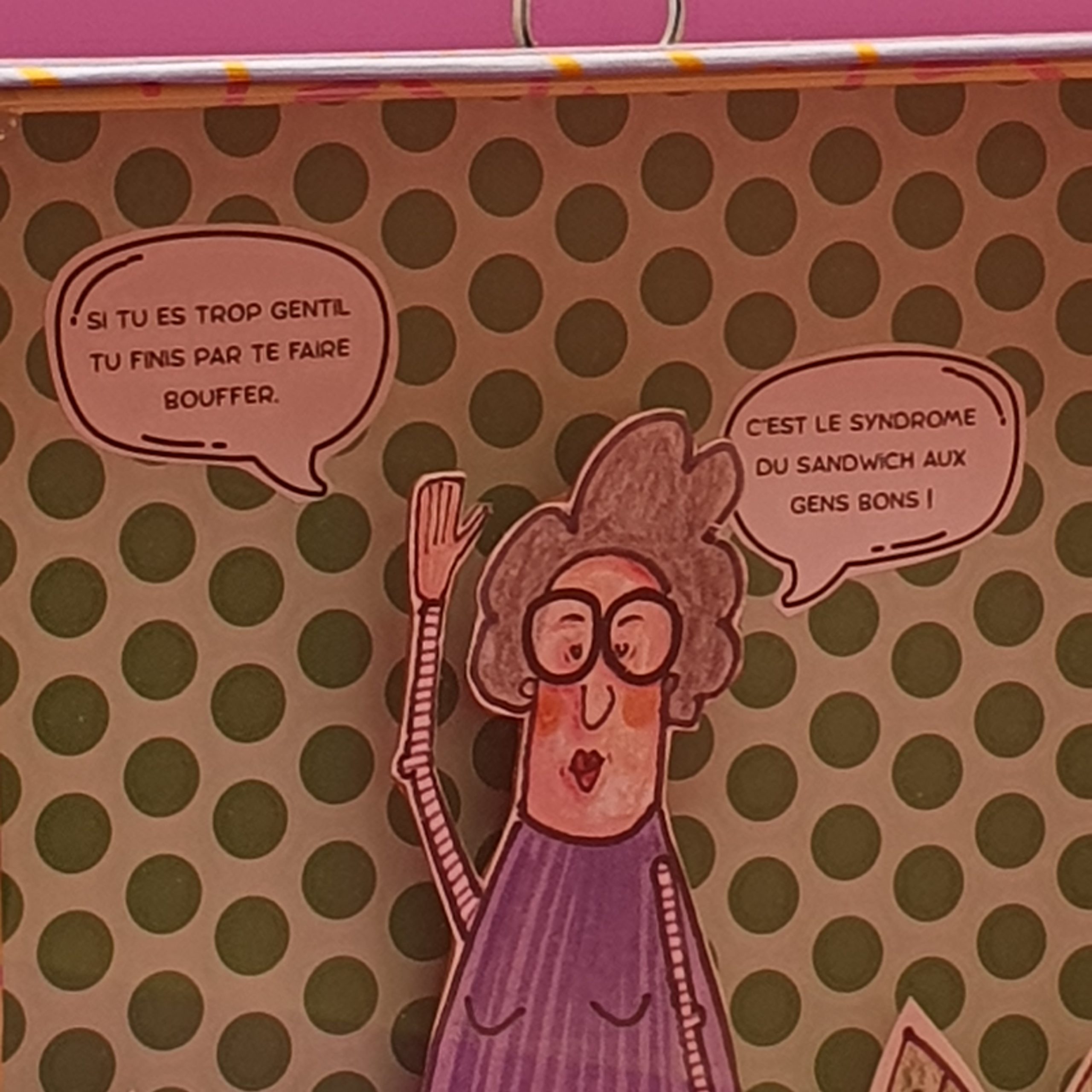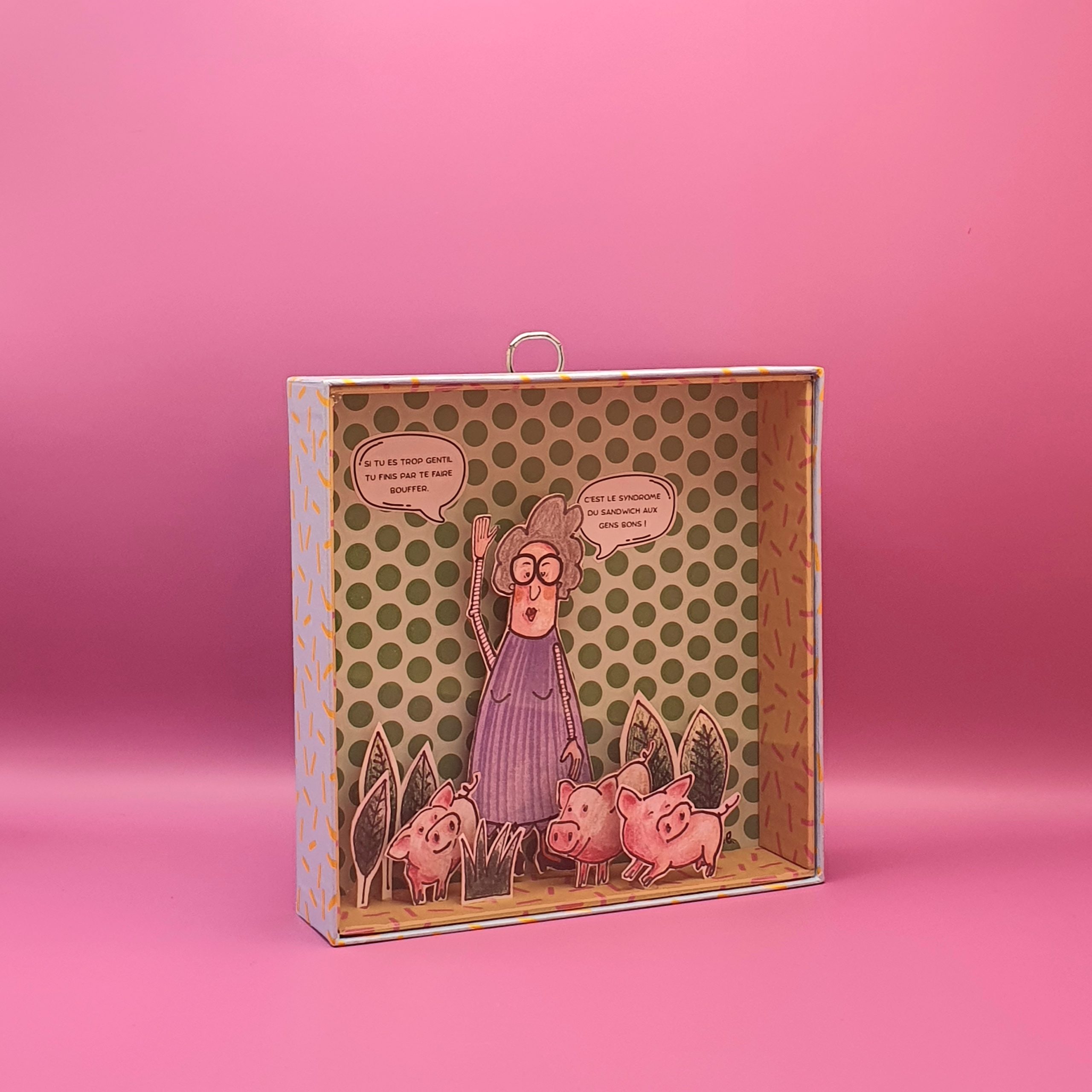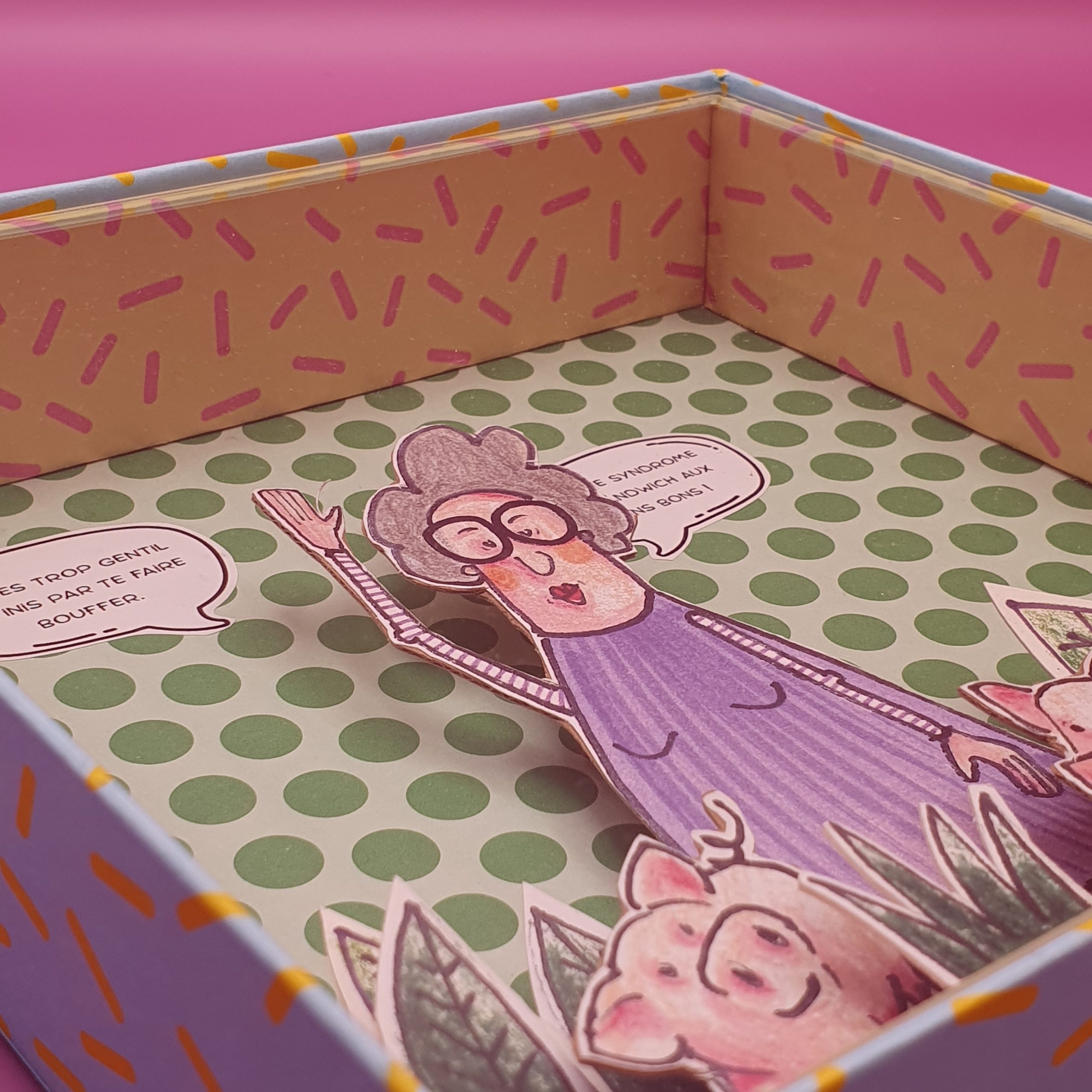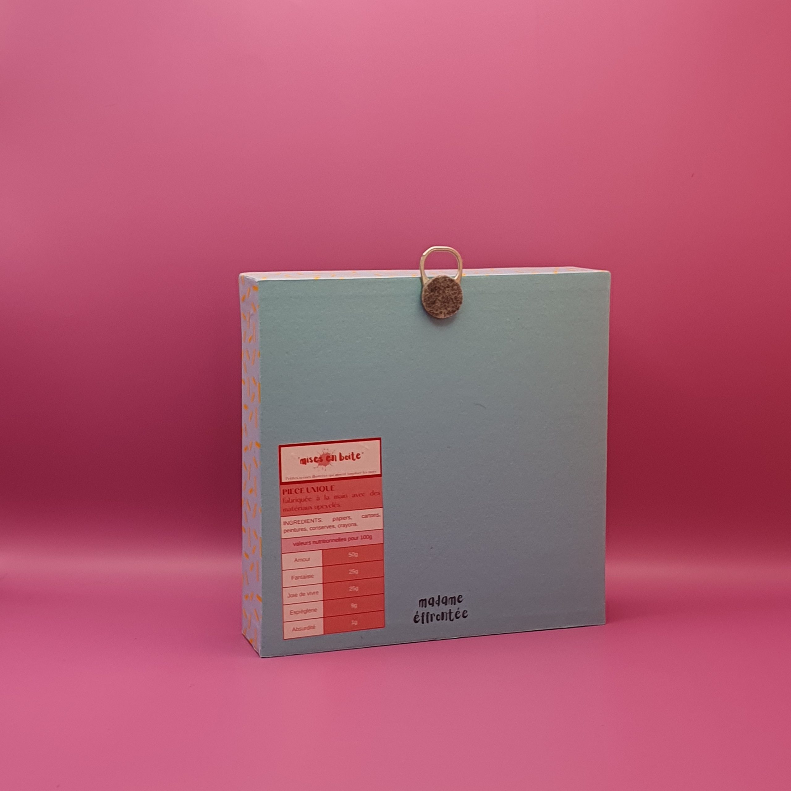 Les mises en boîteConfectionné à l’atelier à partir d’illustrations faite à la main aux crayons de couleurs et de boite de jeux recyclées. Il est pensé comme une fenêtre ouverte sur un monde ludique et taquin.