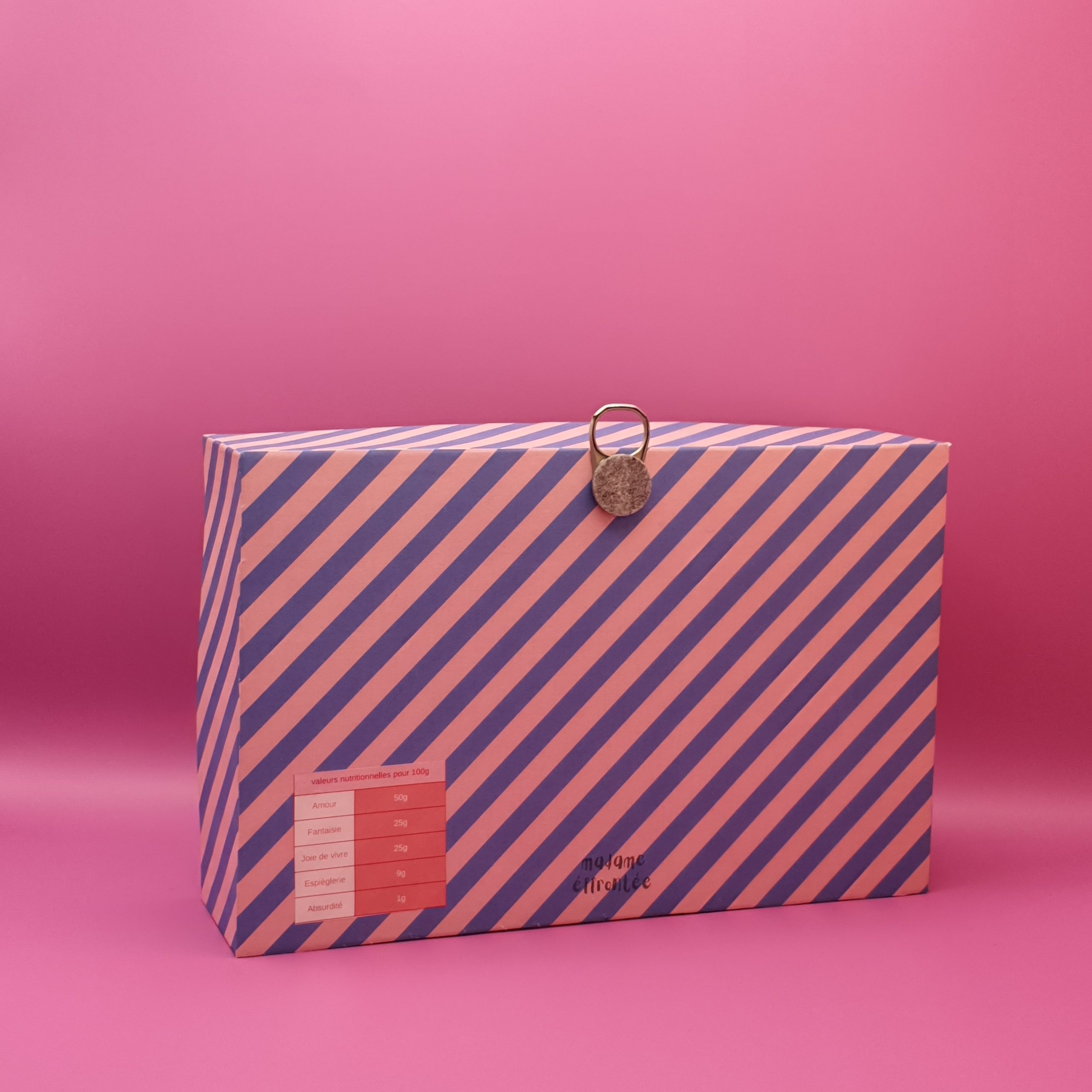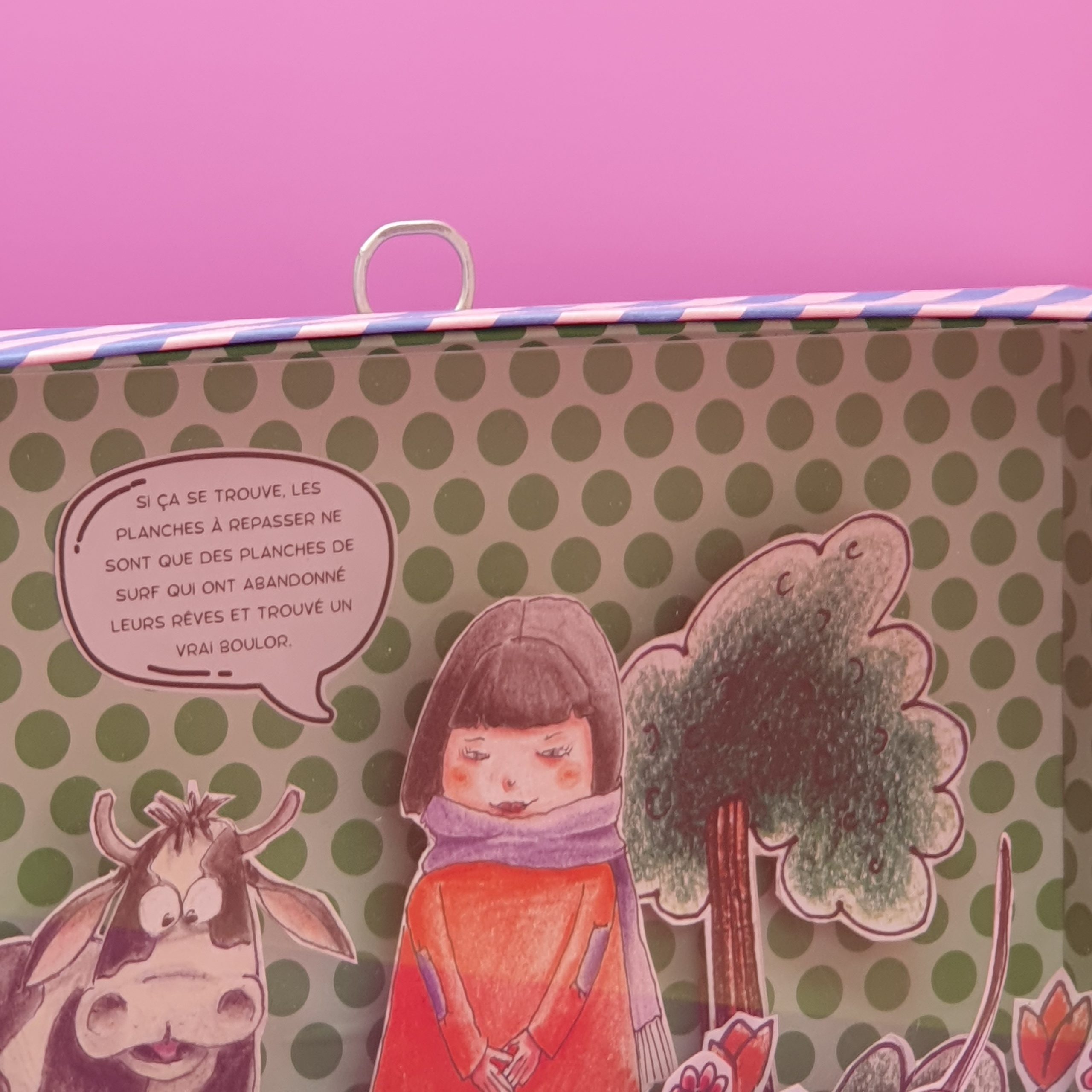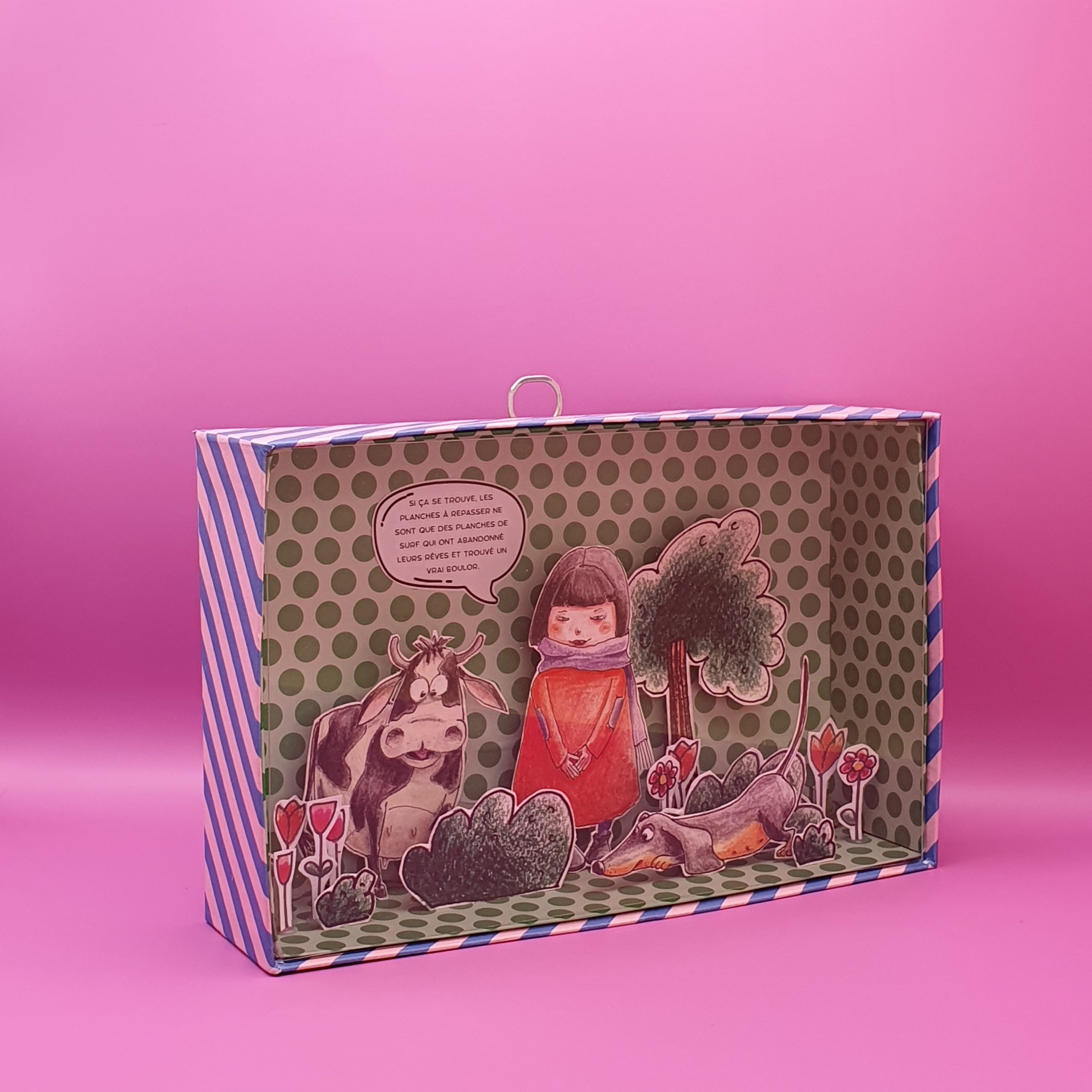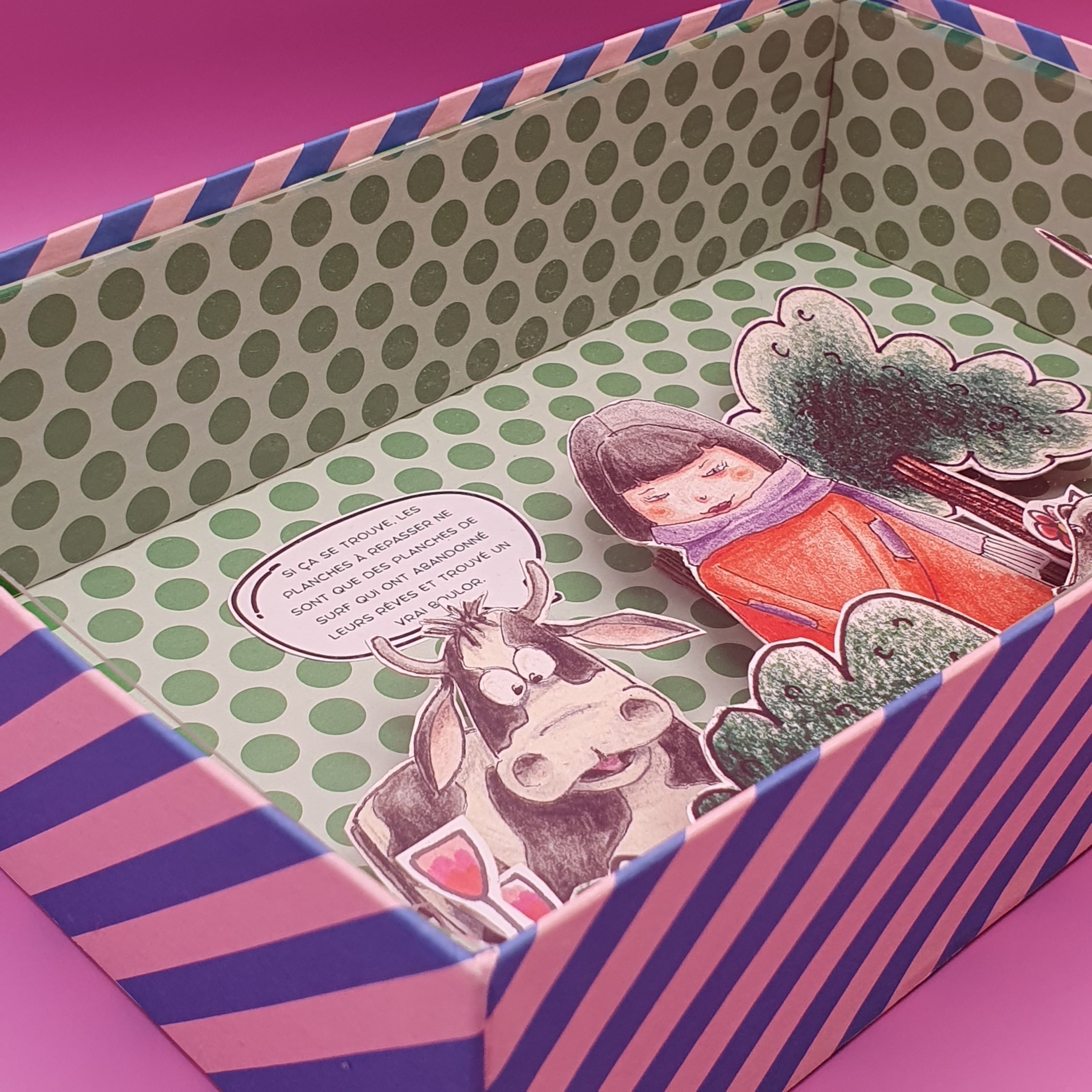 Les mises en boîteConfectionné à l’atelier à partir d’illustrations faite à la main aux crayons de couleurs et de boite de jeux recyclées. Il est pensé comme une fenêtre ouverte sur un monde ludique et taquin.