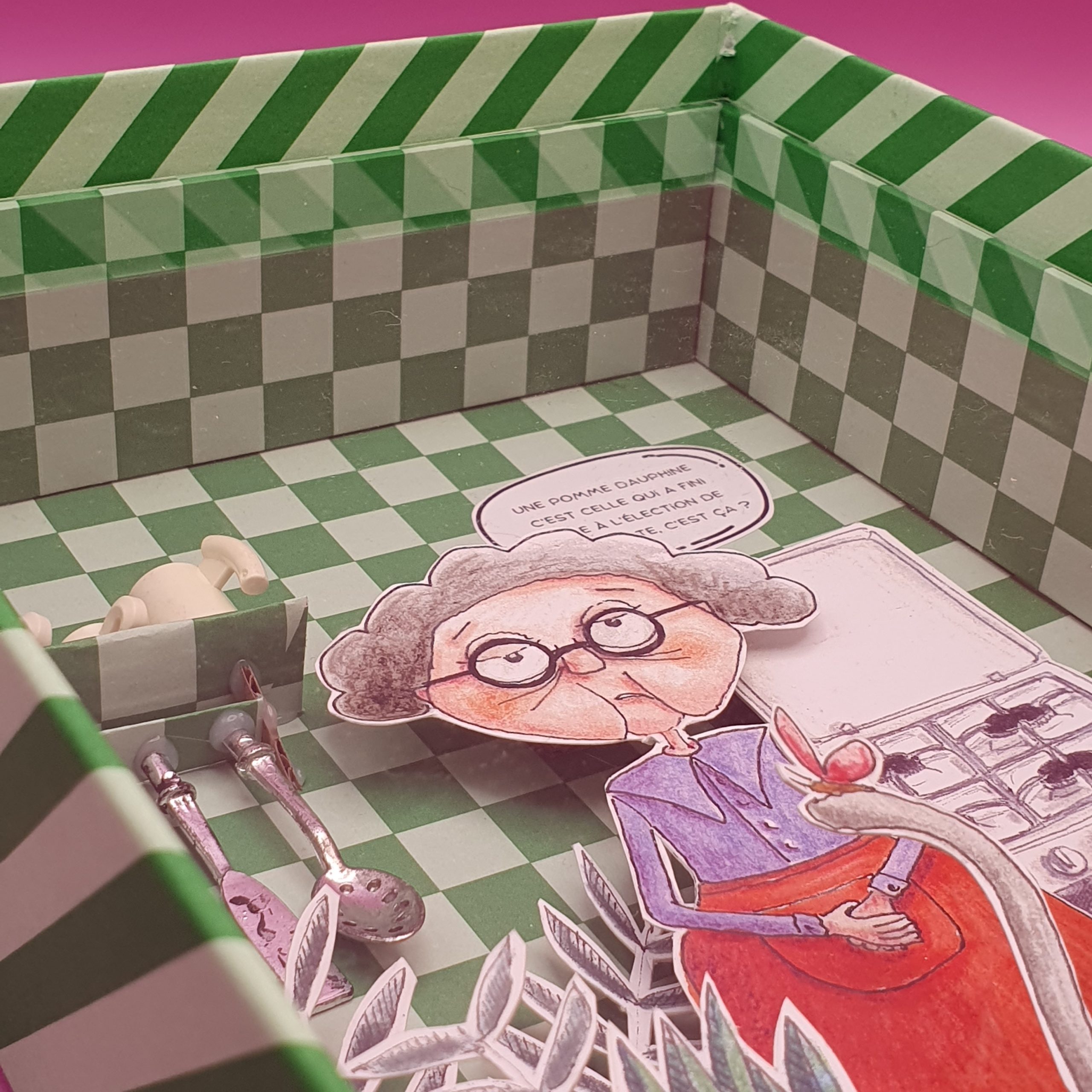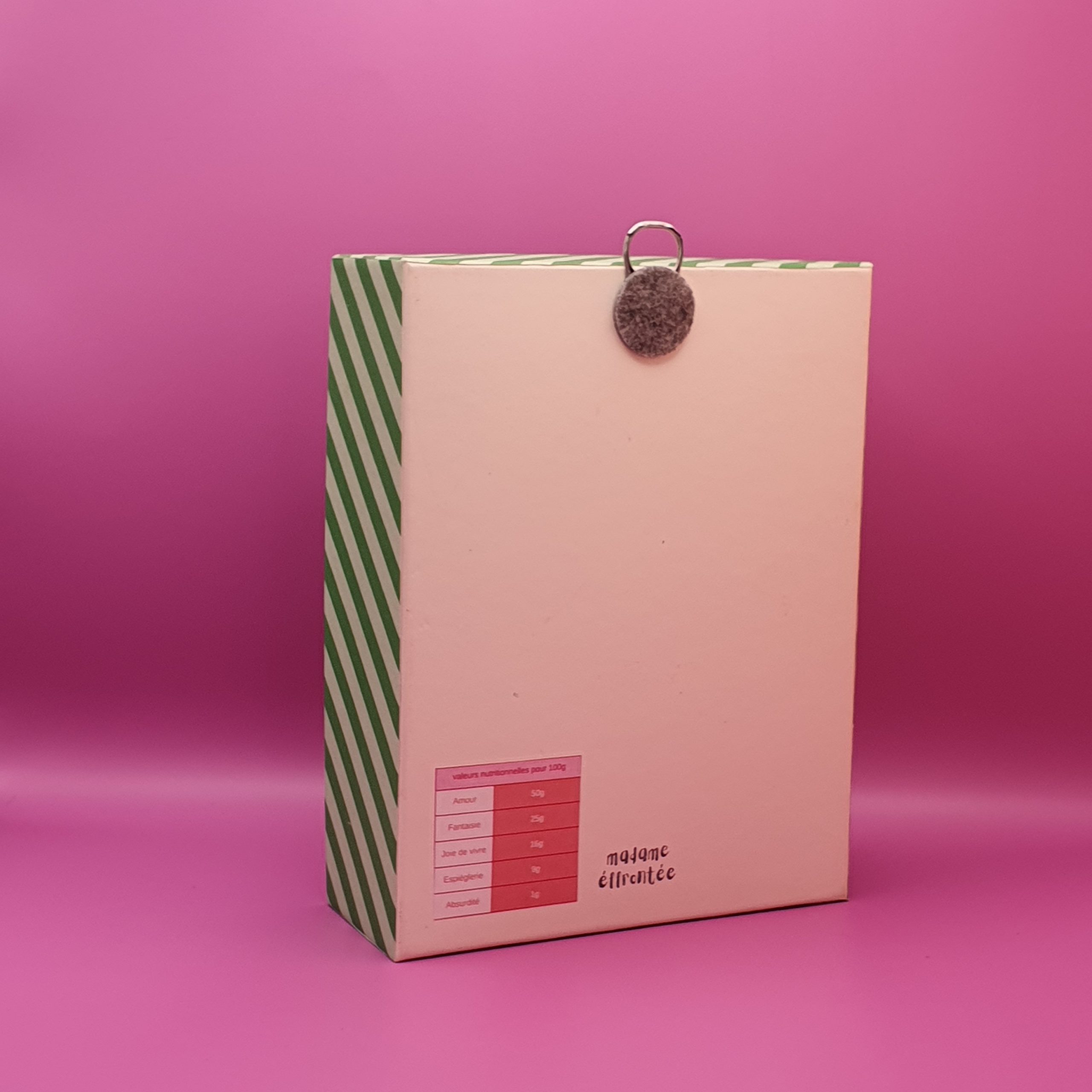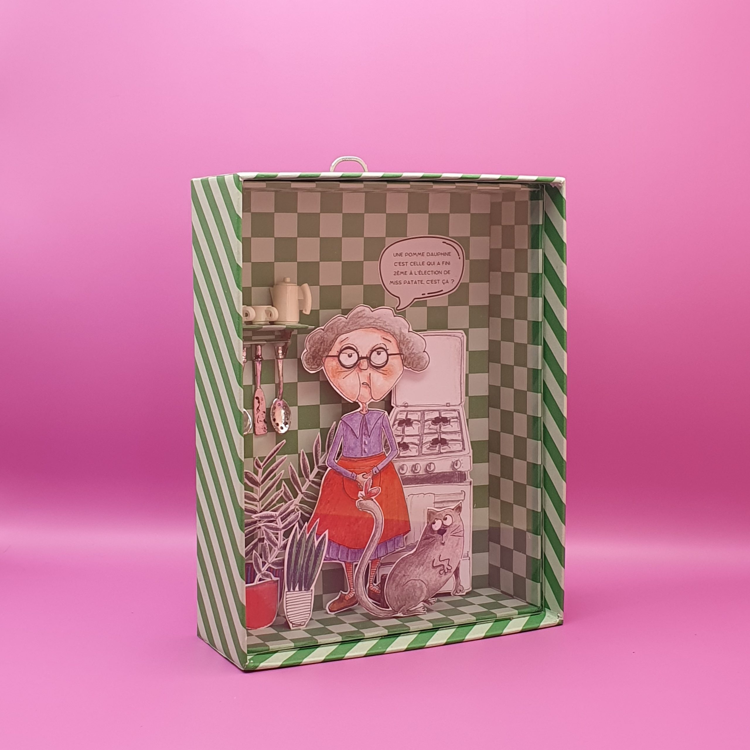 Les mises en boîteConfectionné à l’atelier à partir d’illustrations faite à la main aux crayons de couleurs et de boite de jeux recyclées. Il est pensé comme une fenêtre ouverte sur un monde ludique et taquin.