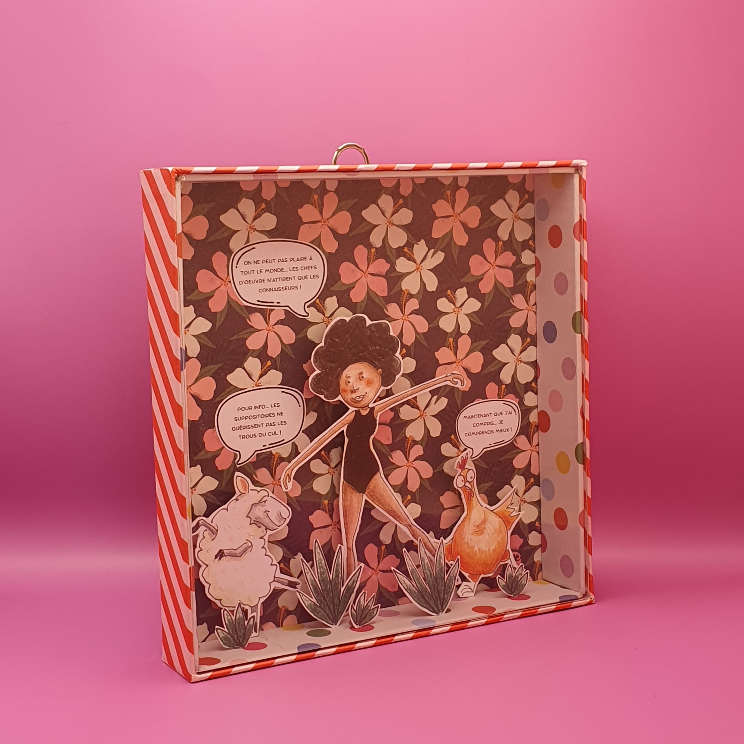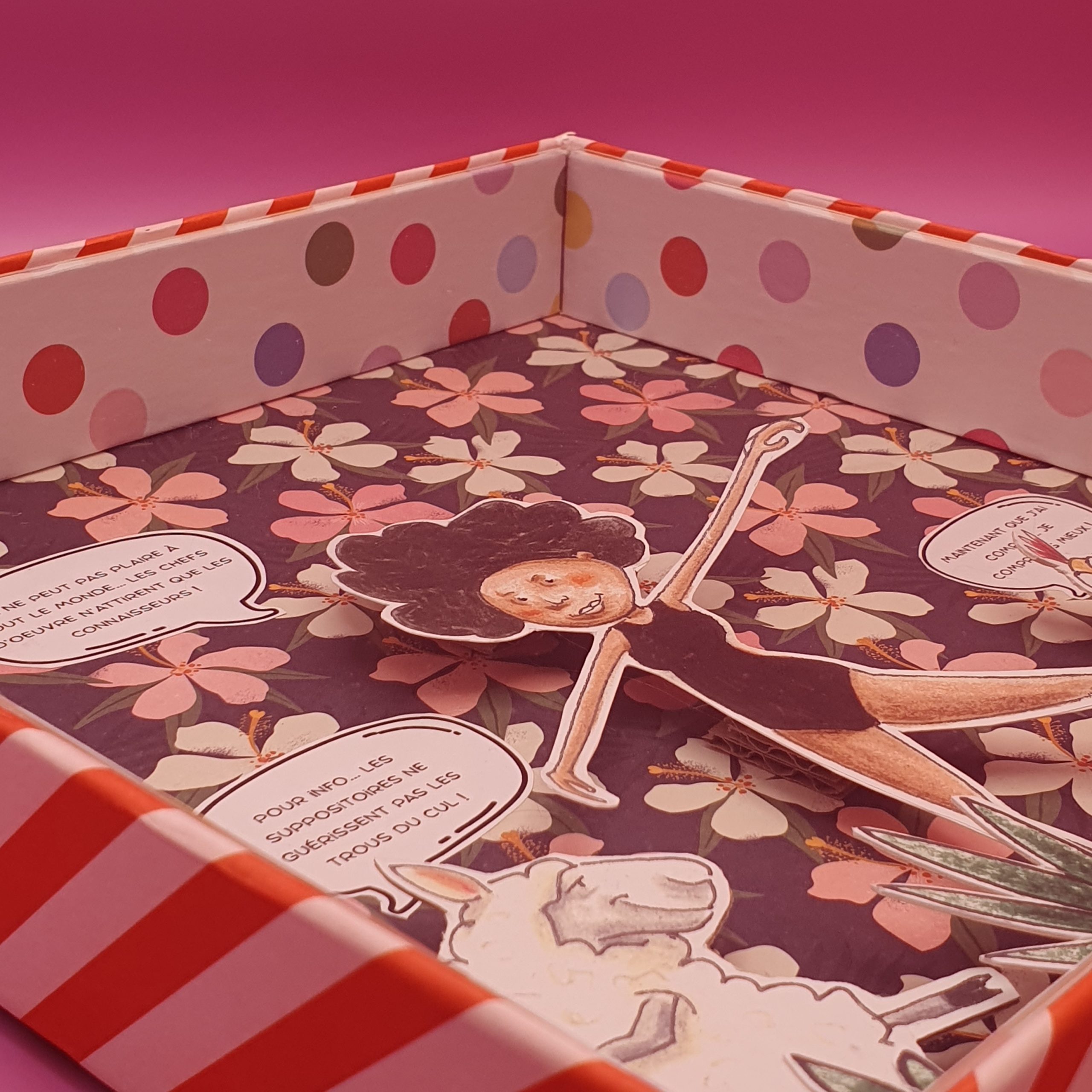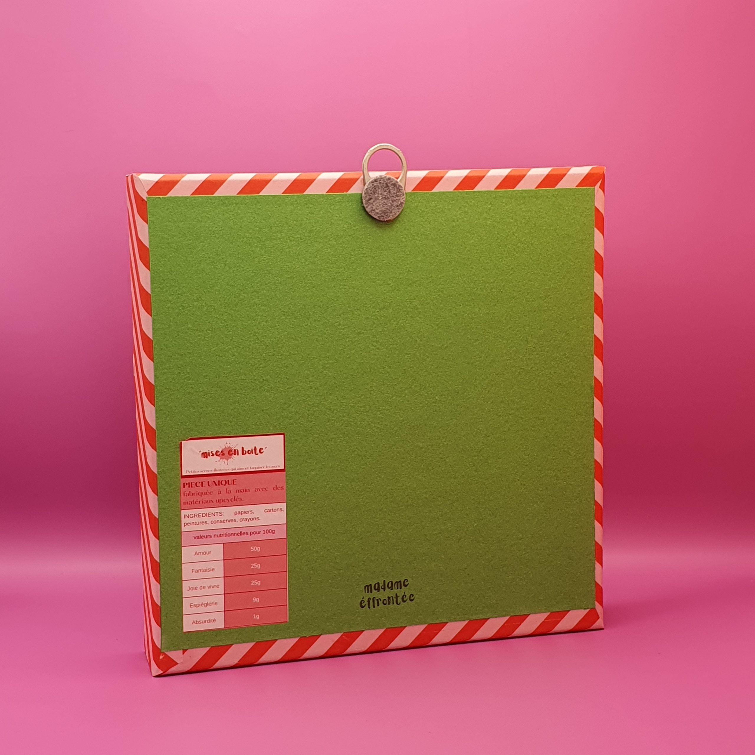 Les mises en boîteConfectionné à l’atelier à partir d’illustrations faite à la main aux crayons de couleurs et de boite de jeux recyclées. Il est pensé comme une fenêtre ouverte sur un monde ludique et taquin.