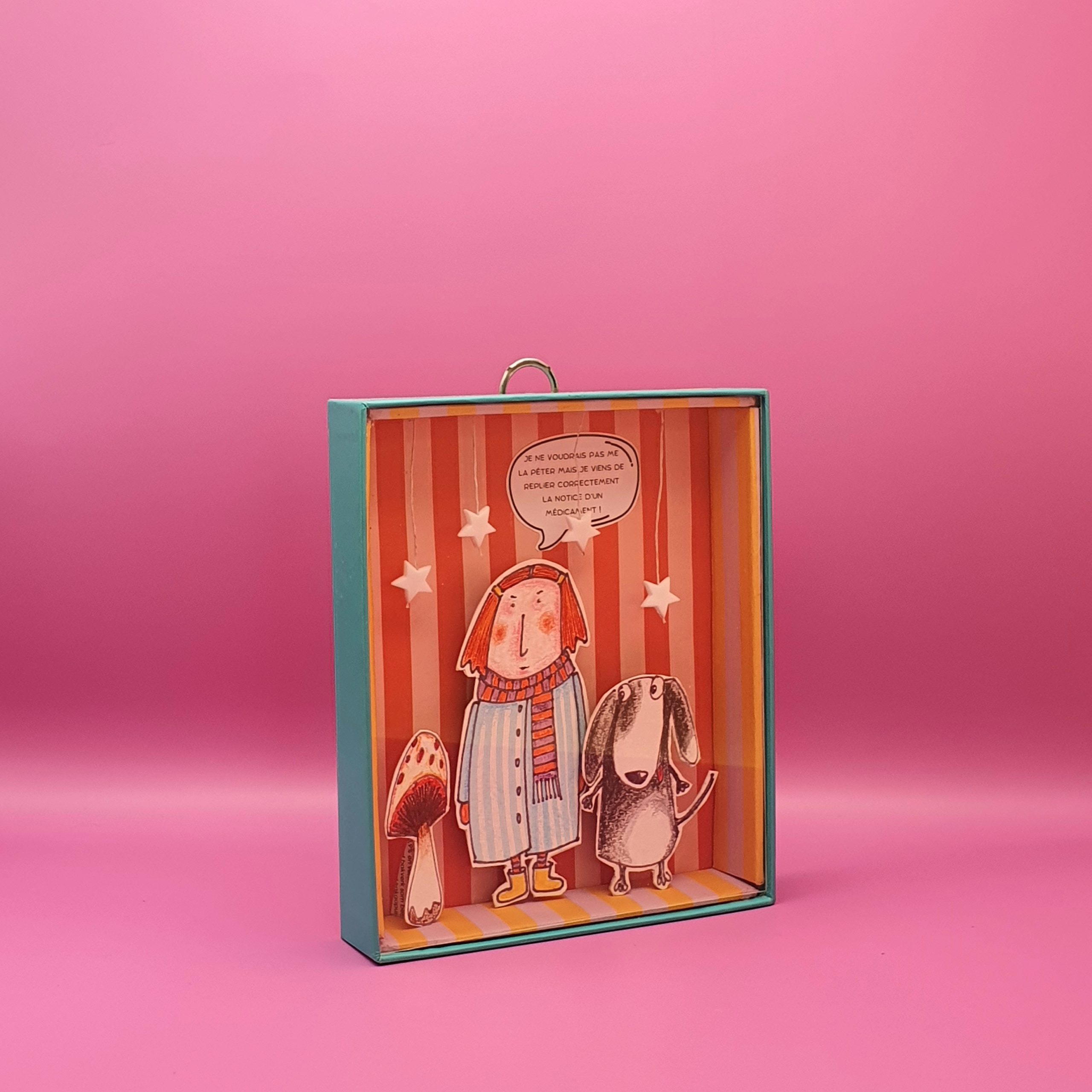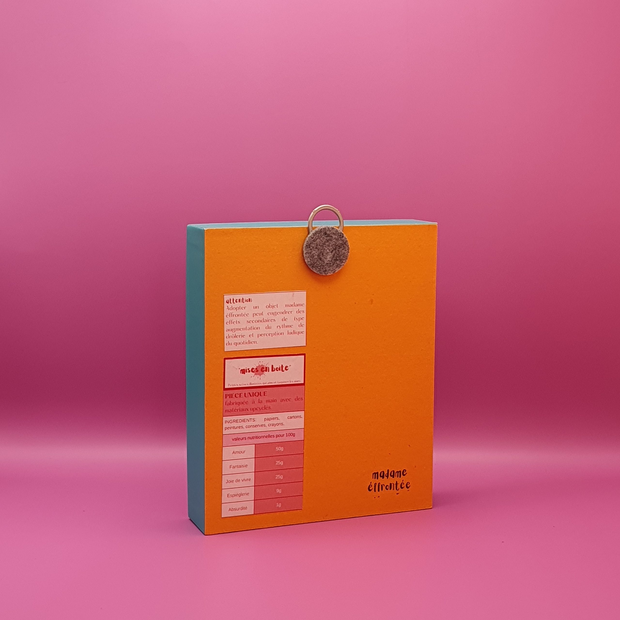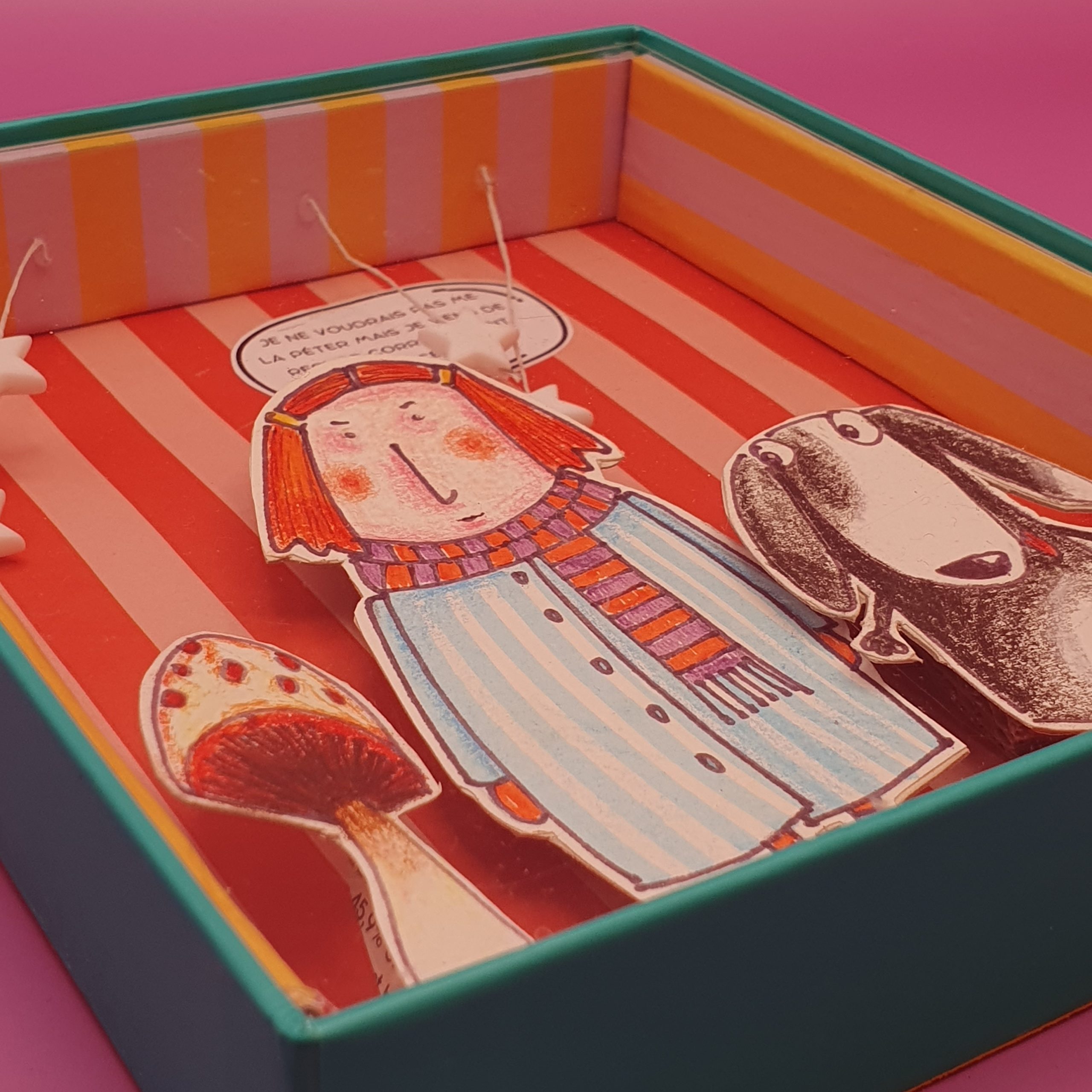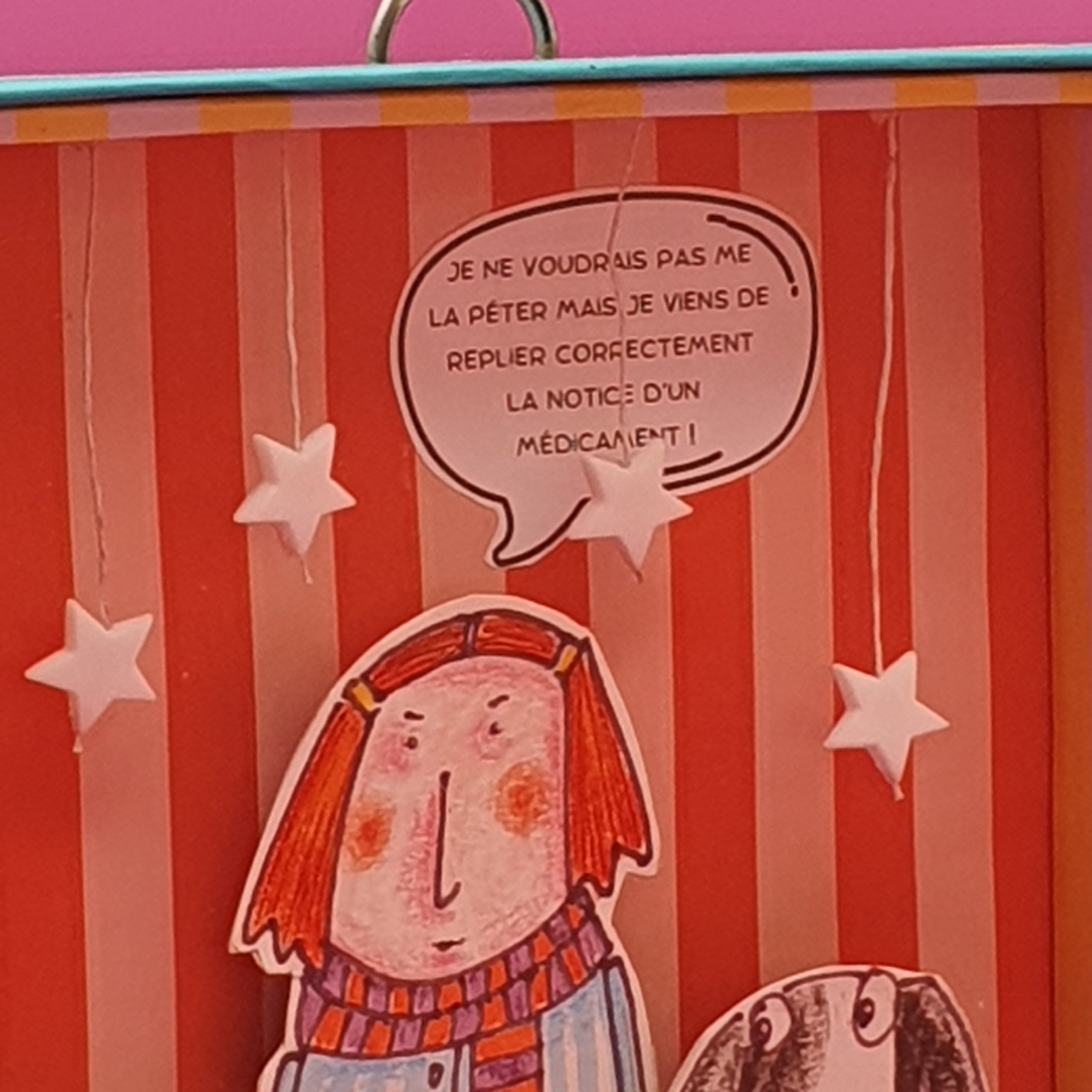 Confectionné à l’atelier à partir d’illustrations faite à la main aux crayons de couleurs et de boite de jeux recyclées. Il est pensé comme une fenêtre ouverte sur un monde ludique et taquin.