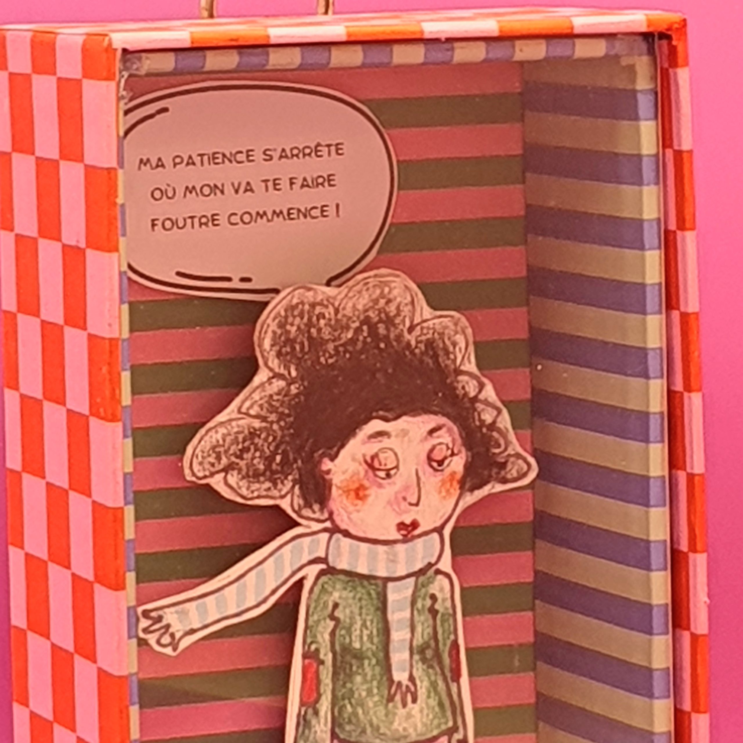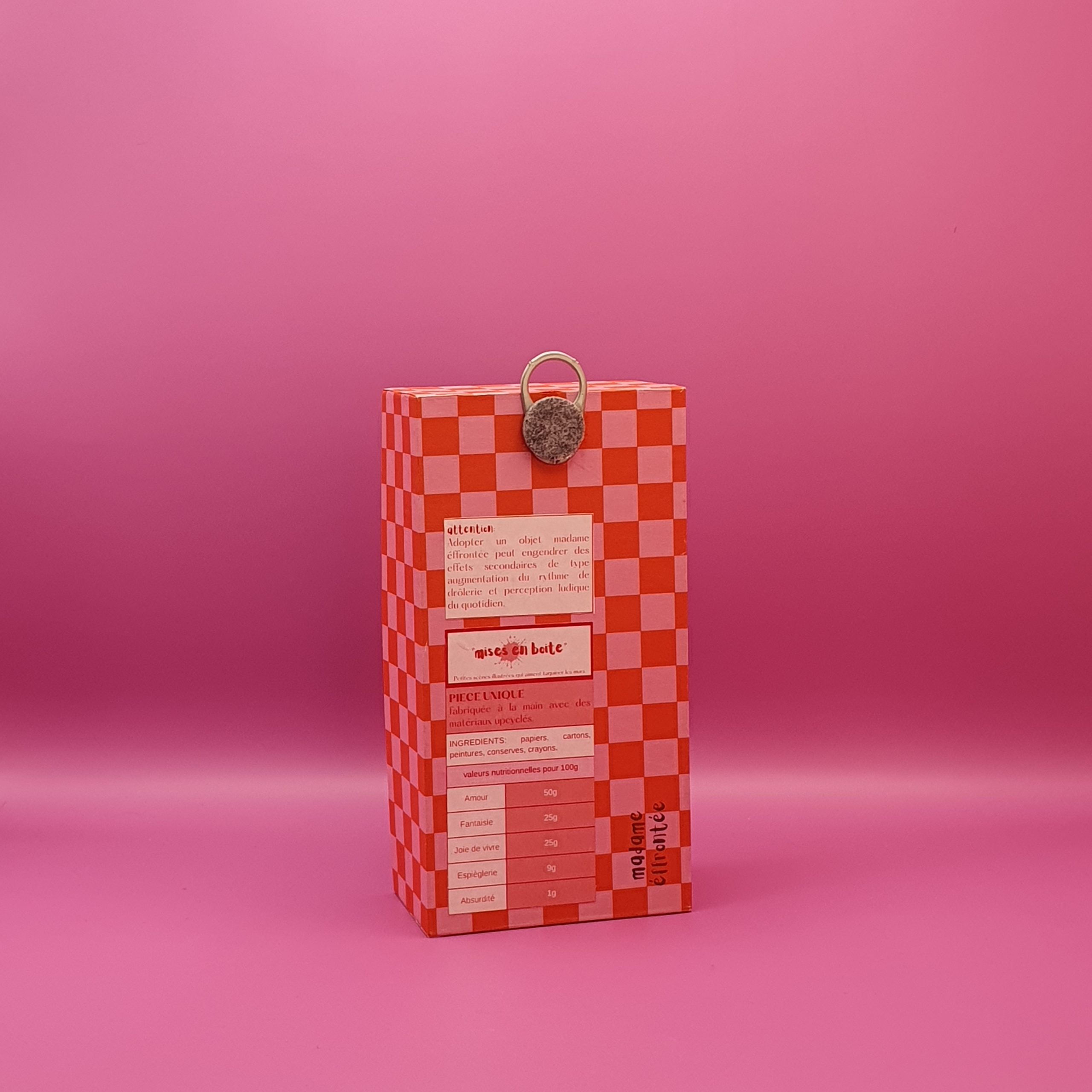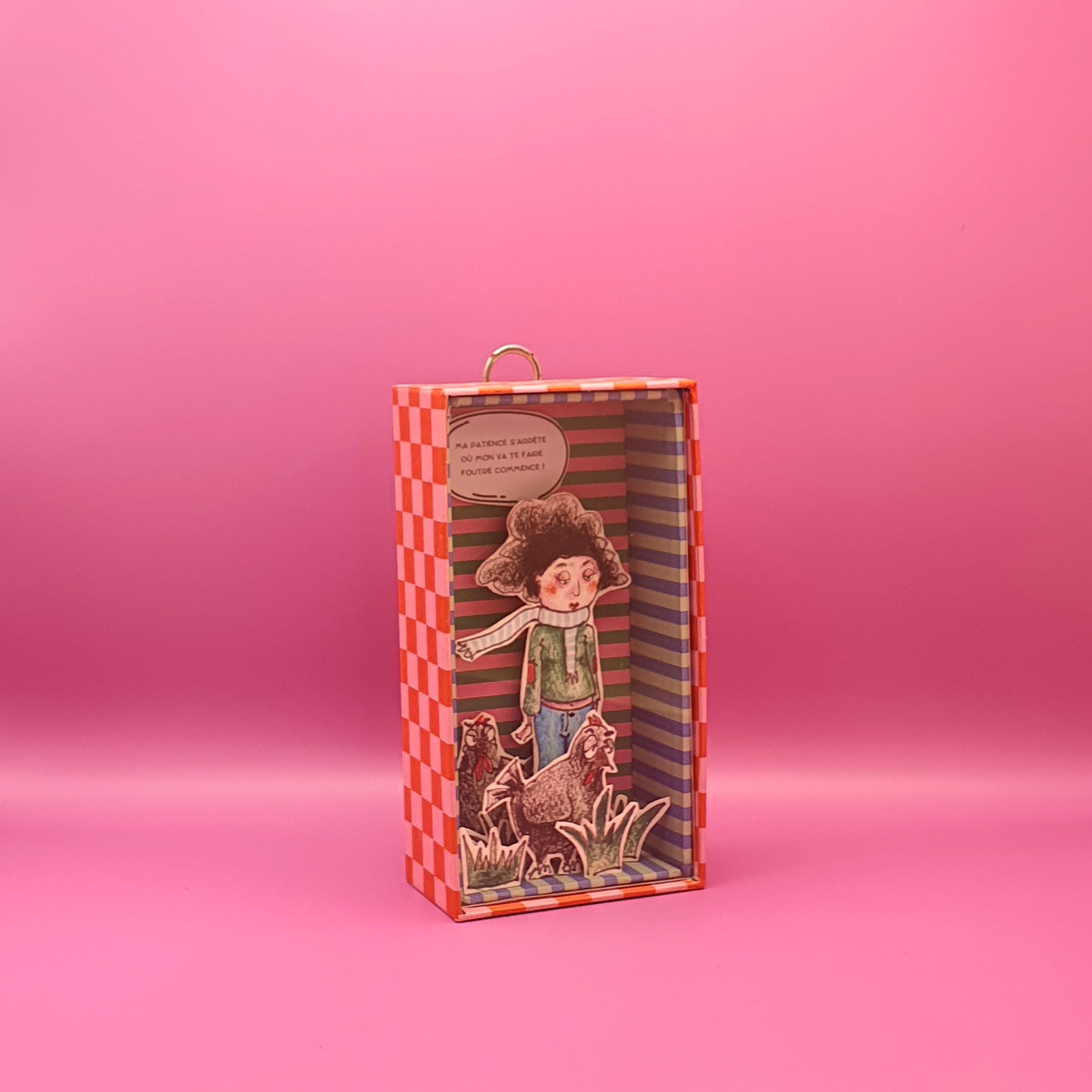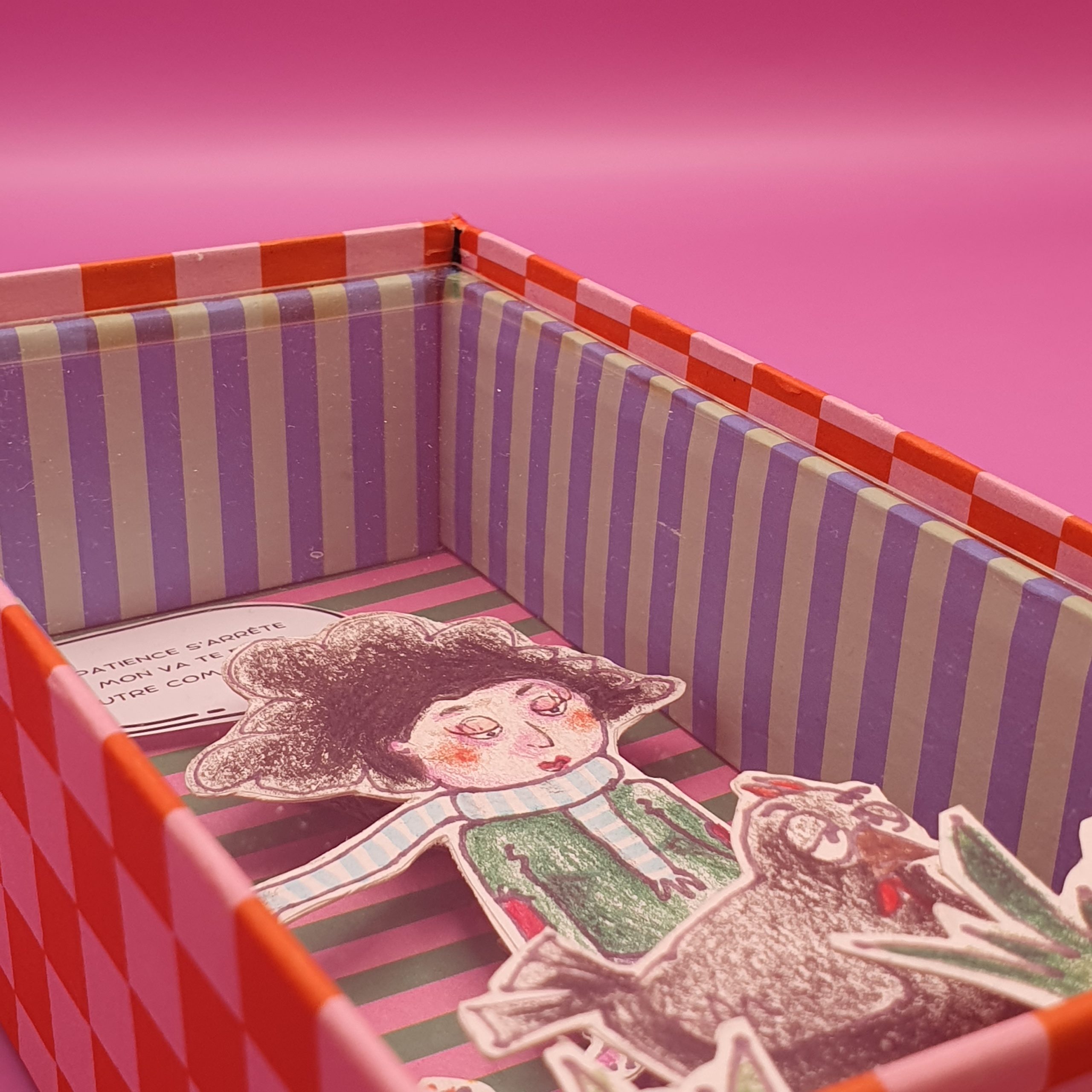 Les mises en boîteConfectionné à l’atelier à partir d’illustrations faite à la main aux crayons de couleurs et de boite de jeux recyclées. Il est pensé comme une fenêtre ouverte sur un monde ludique et taquin.