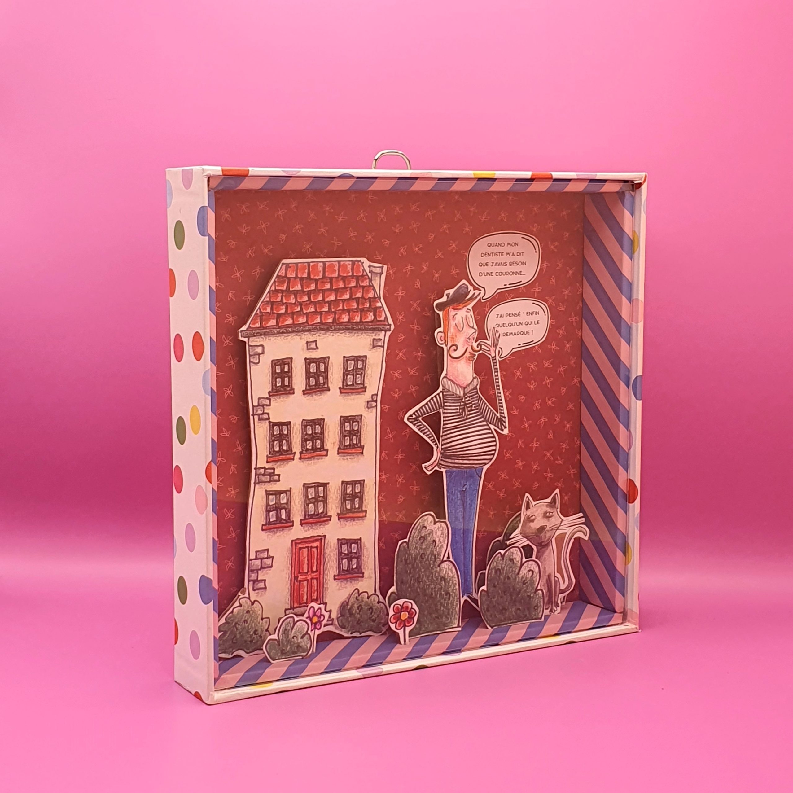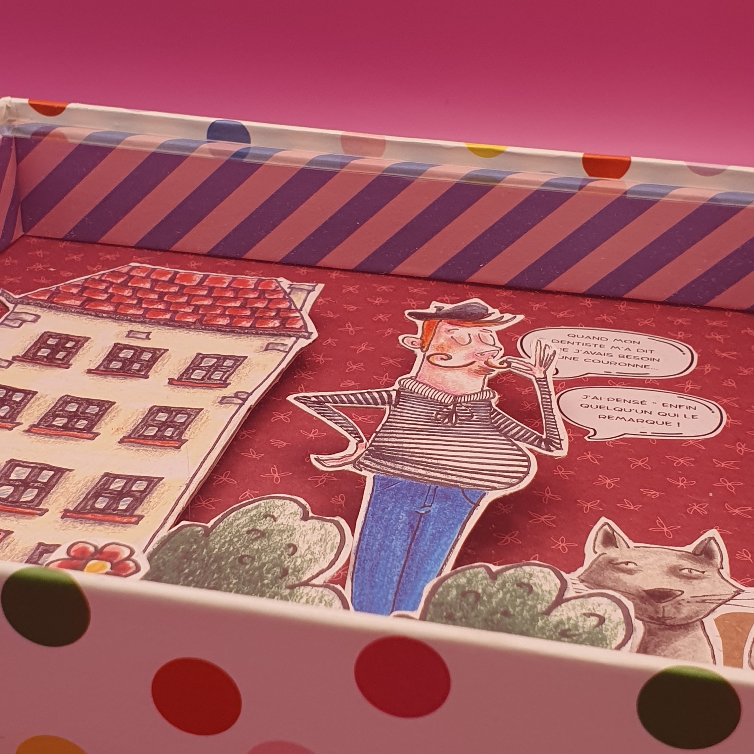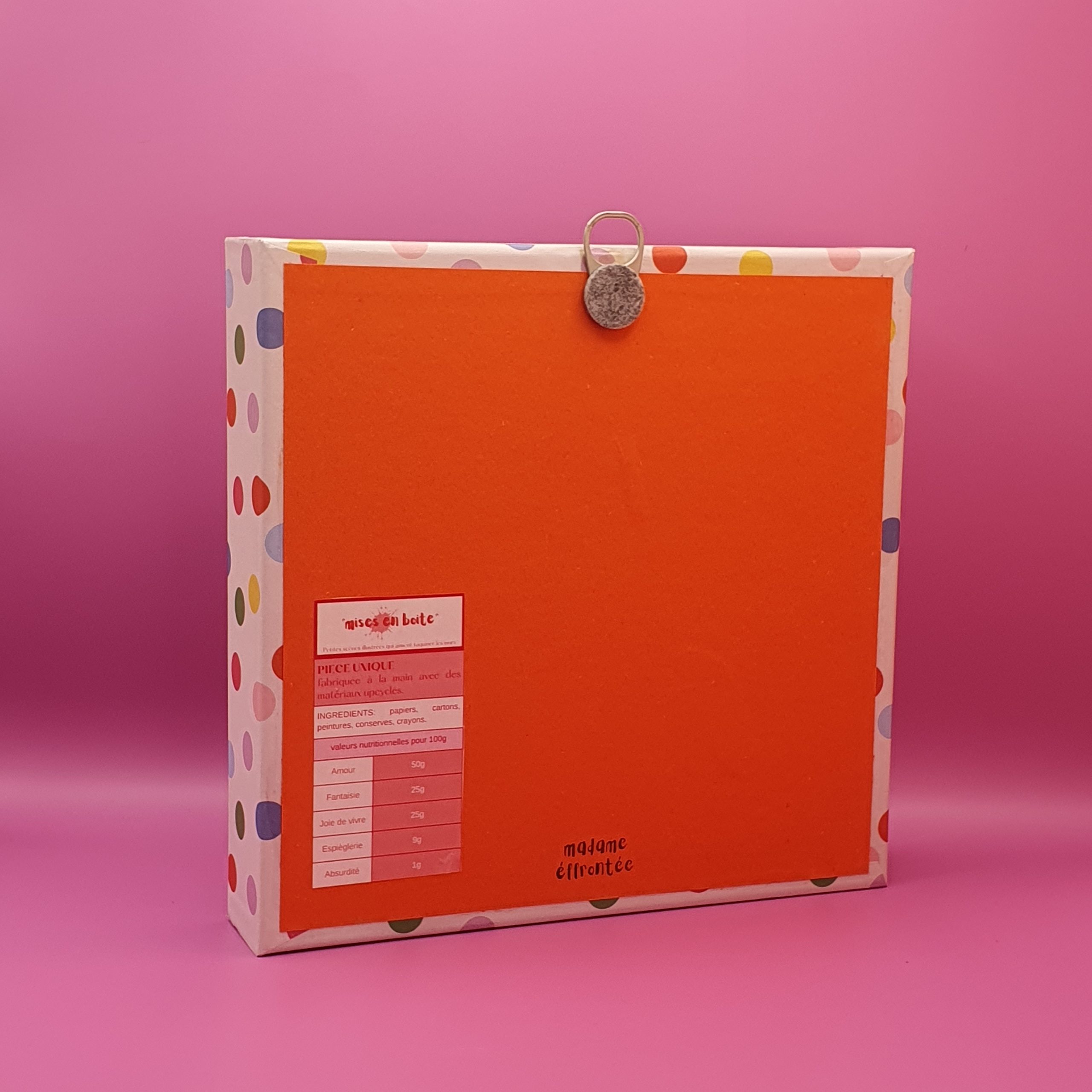 Les mises en boîteConfectionné à l’atelier à partir d’illustrations faite à la main aux crayons de couleurs et de boite de jeux recyclées. Il est pensé comme une fenêtre ouverte sur un monde ludique et taquin.