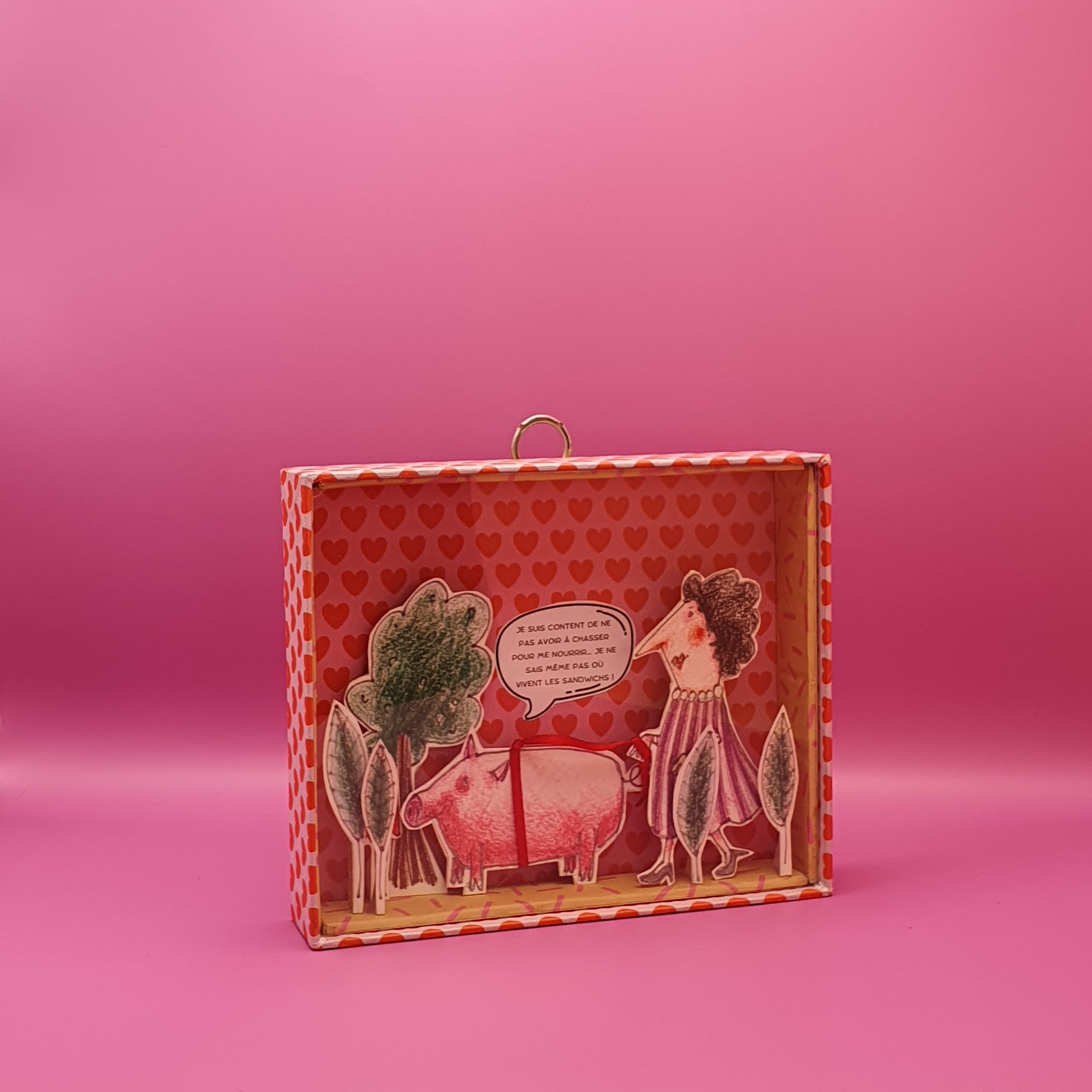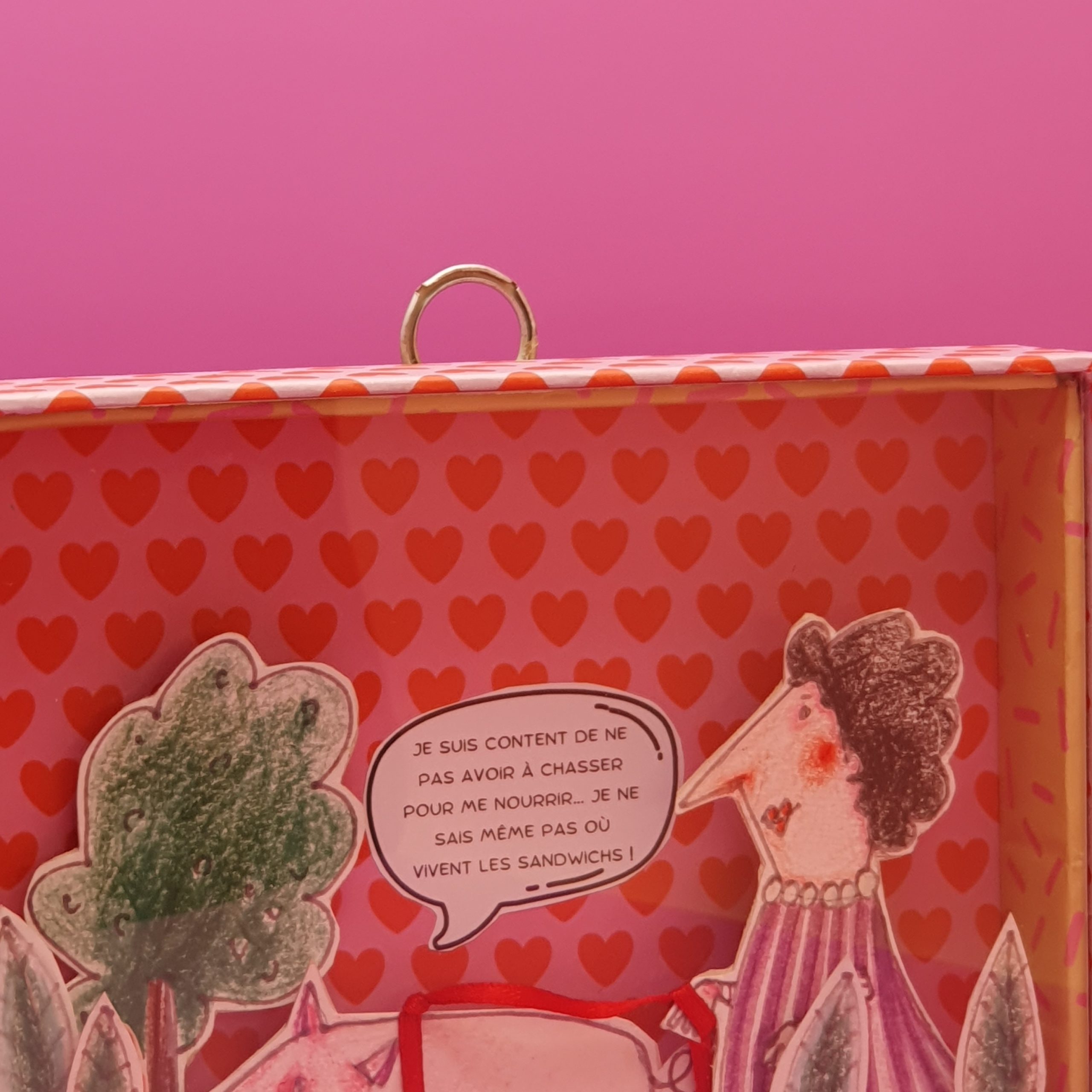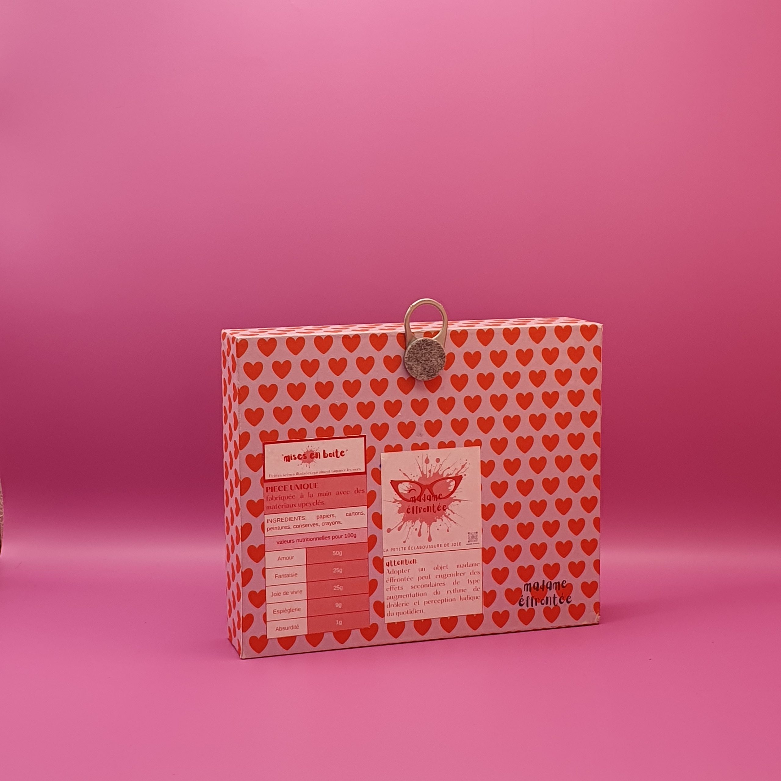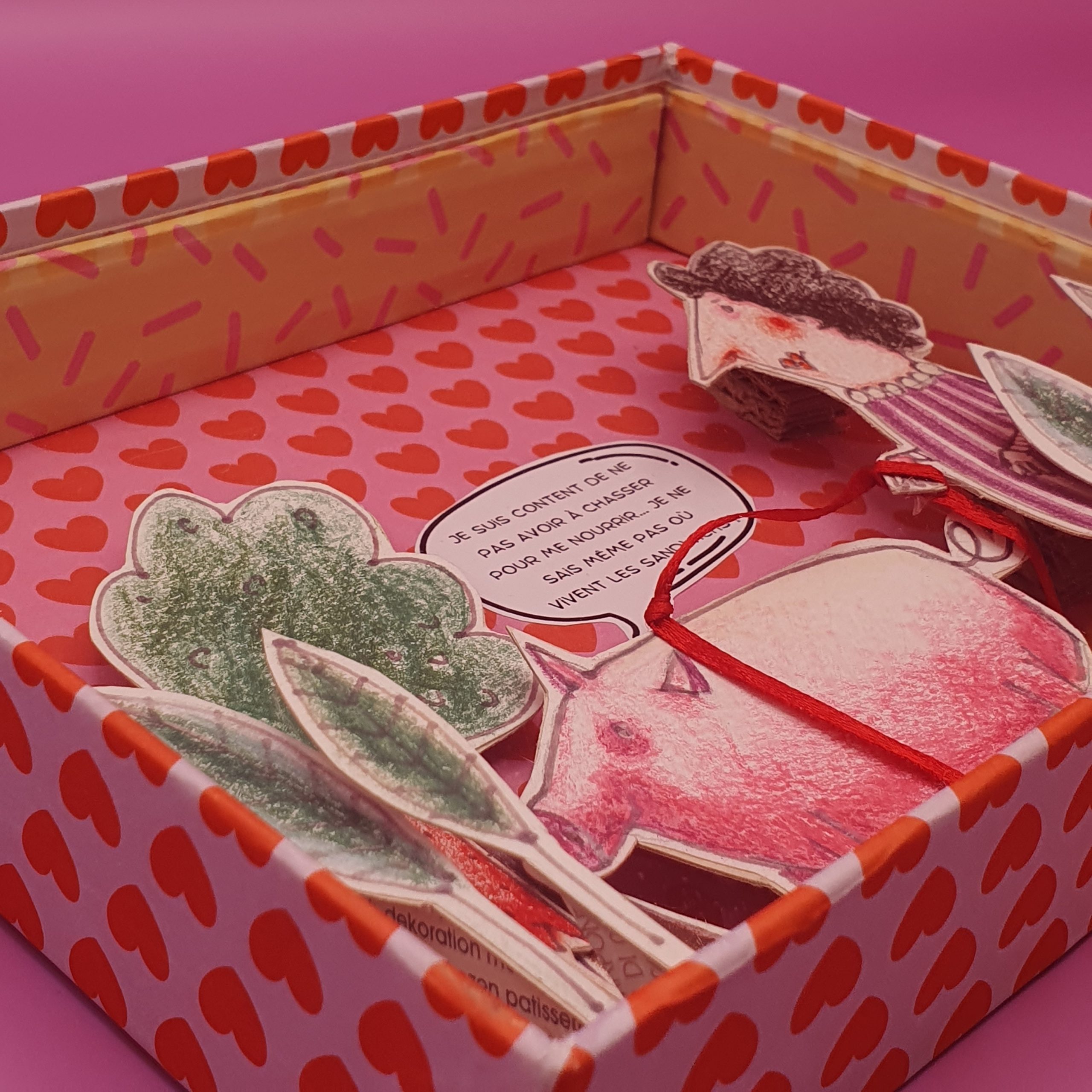Les mises en boîteConfectionné à l’atelier à partir d’illustrations faite à la main aux crayons de couleurs et de boite de jeux recyclées. Il est pensé comme une fenêtre ouverte sur un monde ludique et taquin.