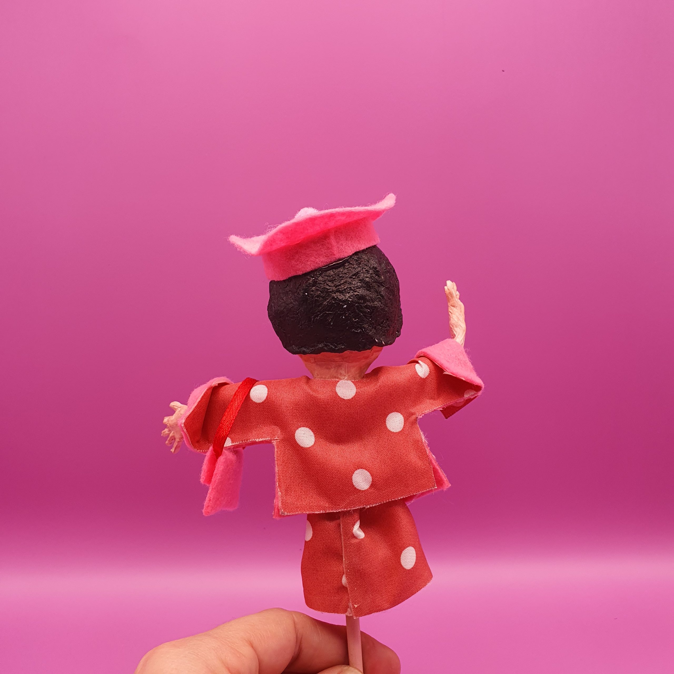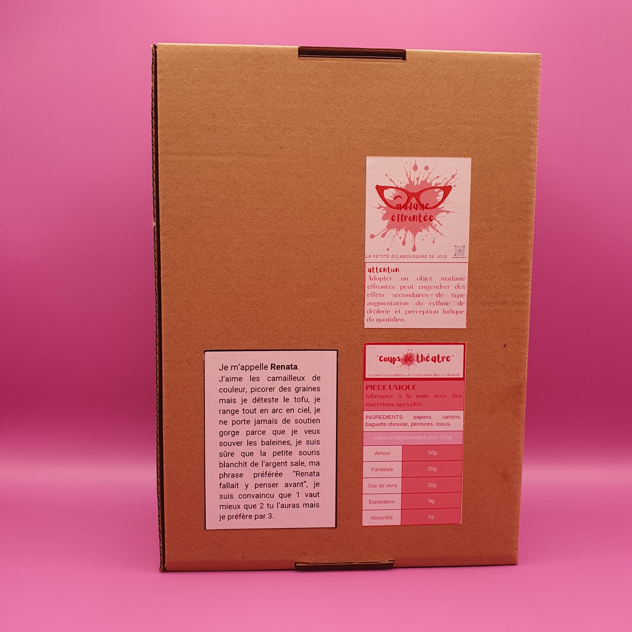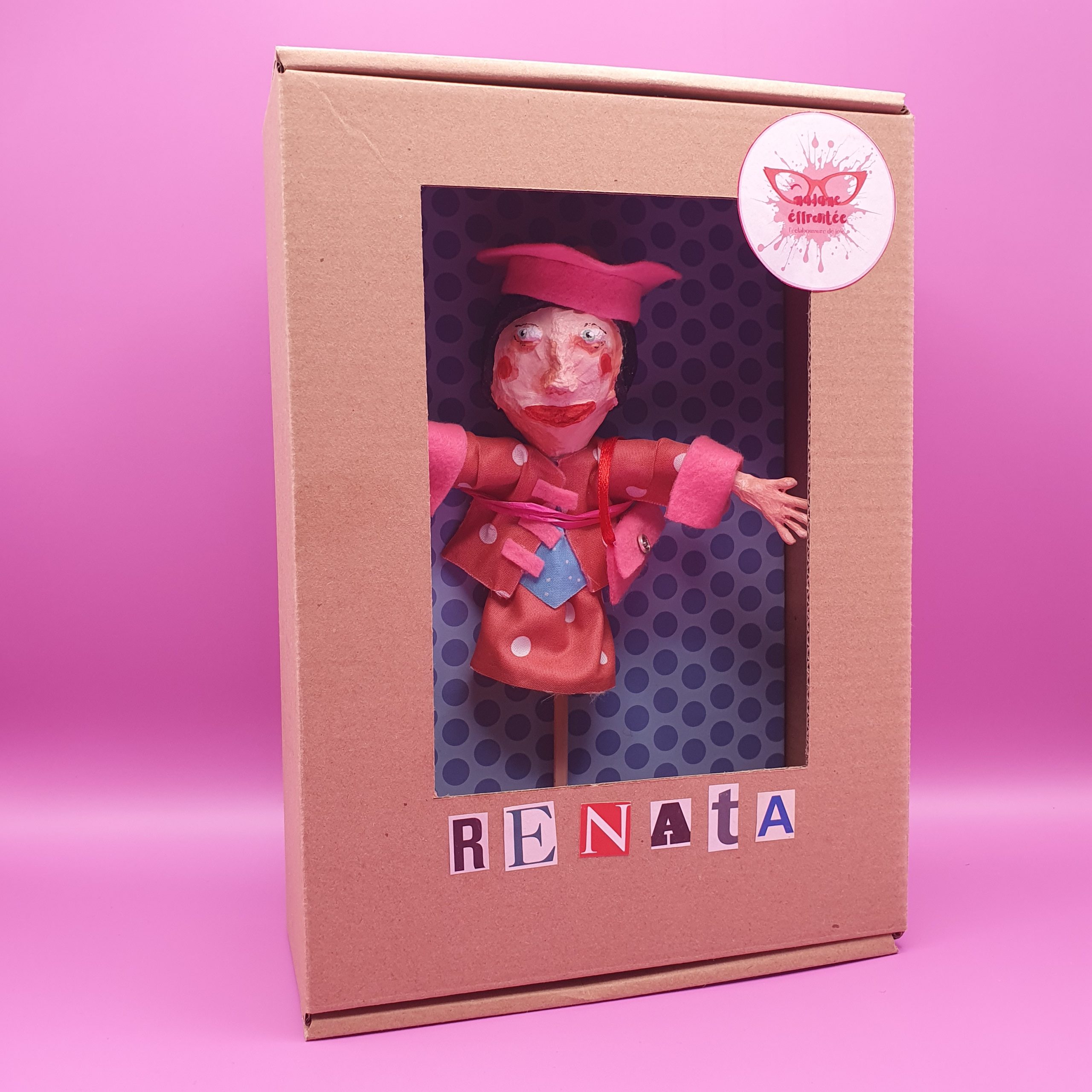 Confectionné à l’atelier avec des matériaux recyclés tel que baguette chinoise, chute de tissu, prospectus, rouleau de sopalin…la rionnette est l’indispensable camarade des jours moroses pour faire dérailler le train train quotidien.